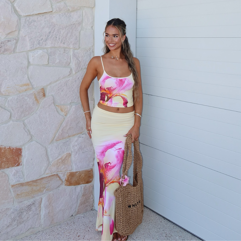 Bright enough for daylight, bold enough for after dark the Akio Two Piece Set carries you smoothly from sunny brunches to evening cocktails. The fabric feels soft and airy against skin, and the skirt’s swingy silhouette offers freedom of movement without losing shape.
