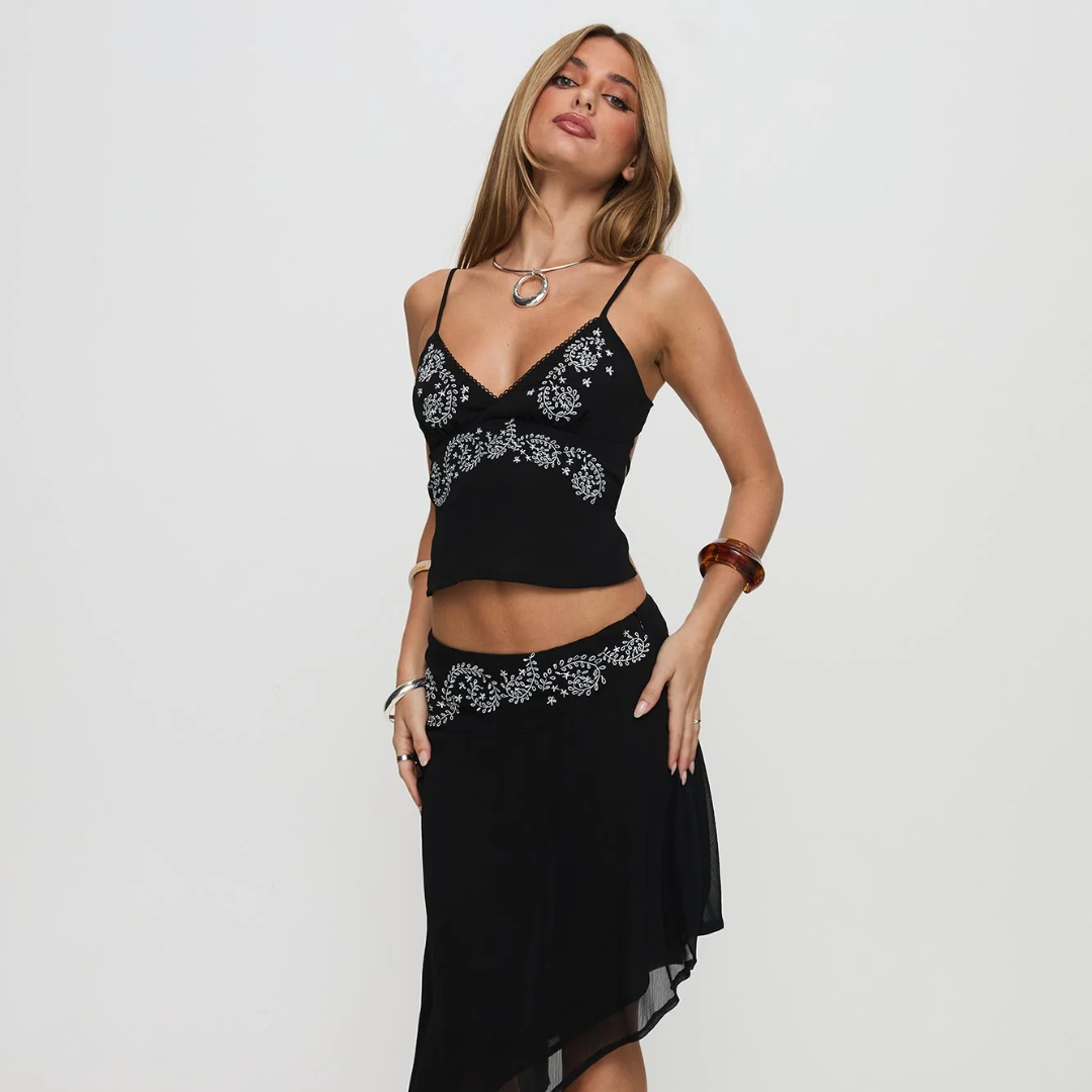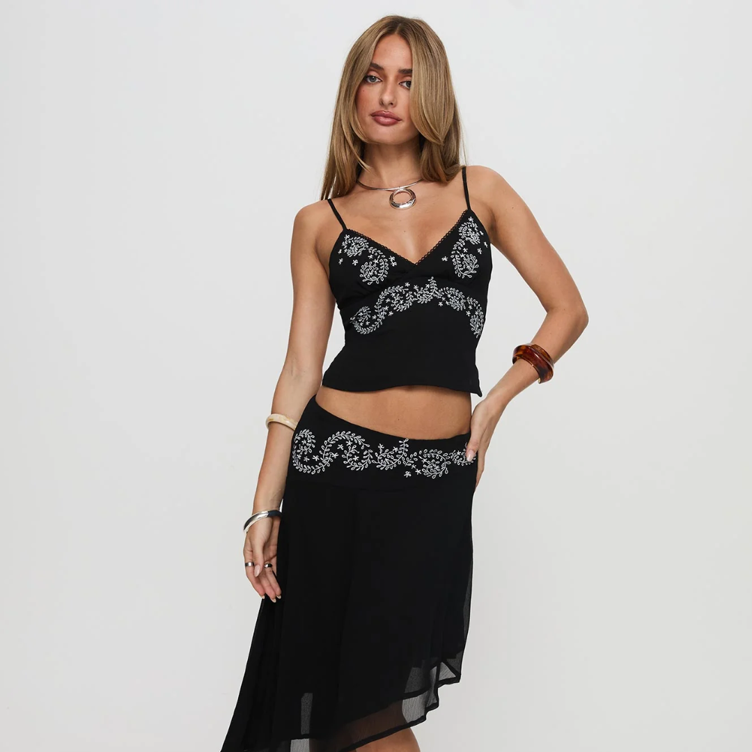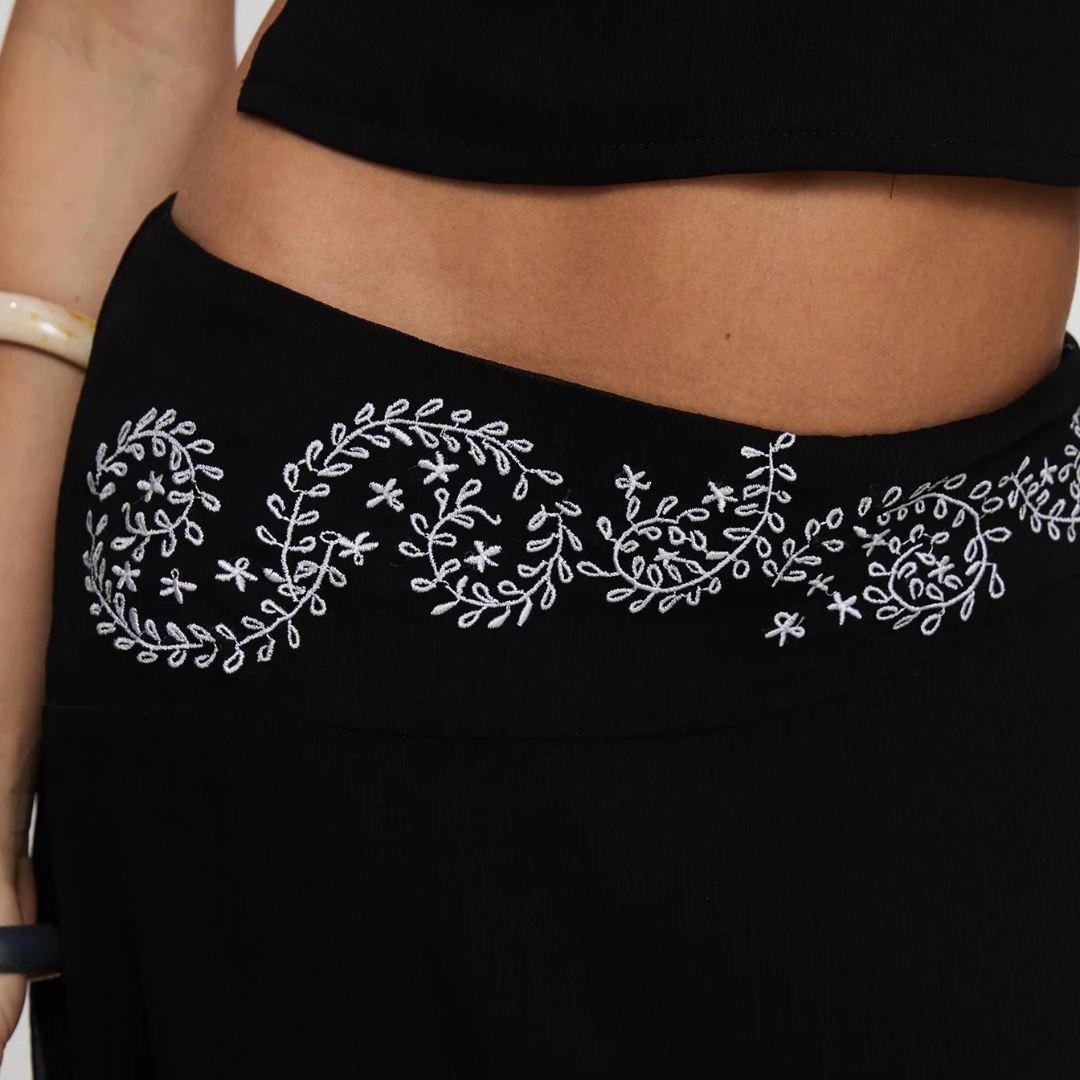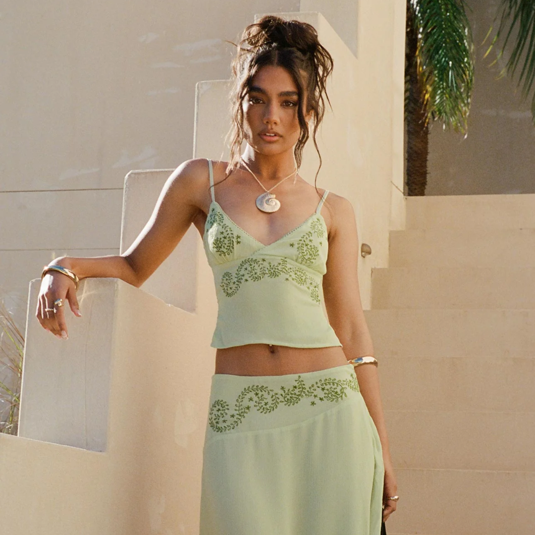 Bless your wardrobe with the Liora Duo. A delicate two piece with embroidered floral mesh and a soft, fully lined base. Adjustable straps and an open back tie create a flattering fit, while the flowy skirt adds movement and grace. Available in mint or black, it’s the perfect set for brunches, dates, or any moment you want to feel effortlessly elegant.