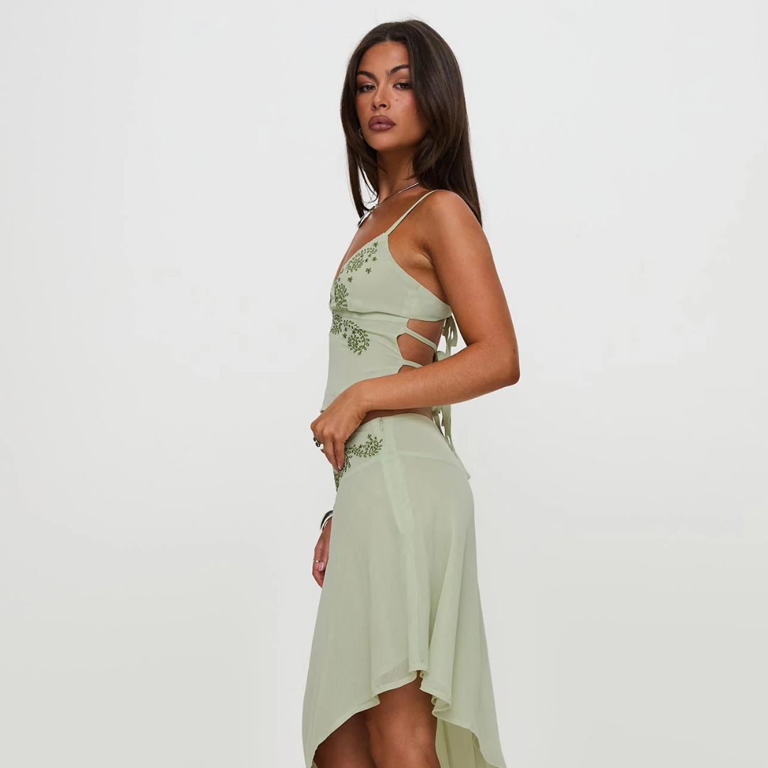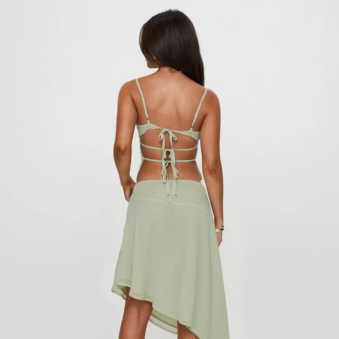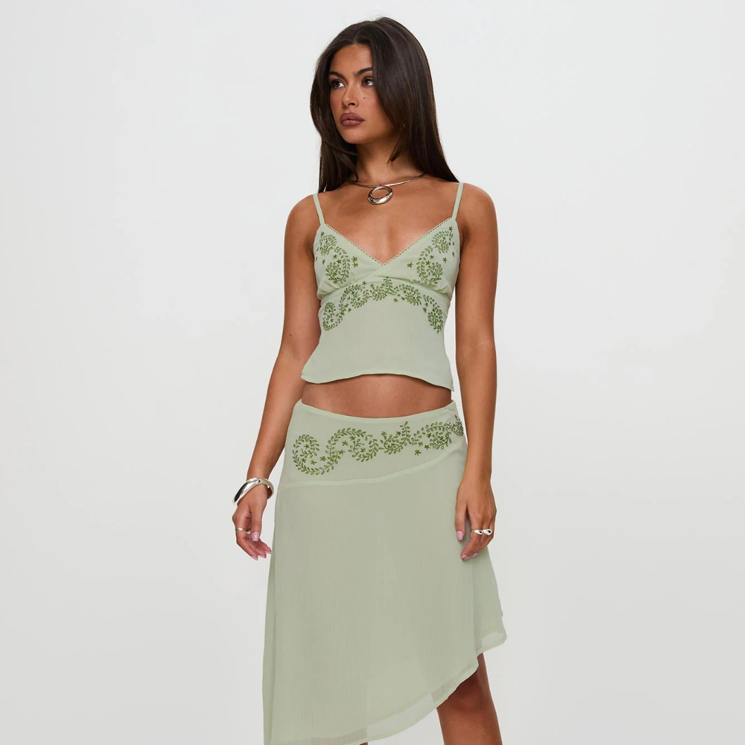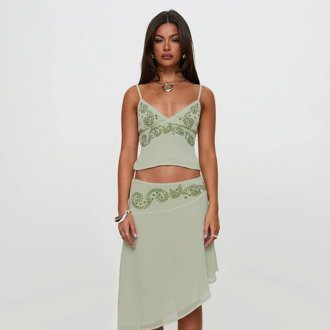 Bless your wardrobe with the Liora Duo. A delicate two piece with embroidered floral mesh and a soft, fully lined base. Adjustable straps and an open back tie create a flattering fit, while the flowy skirt adds movement and grace. Available in mint or black, it’s the perfect set for brunches, dates, or any moment you want to feel effortlessly elegant.