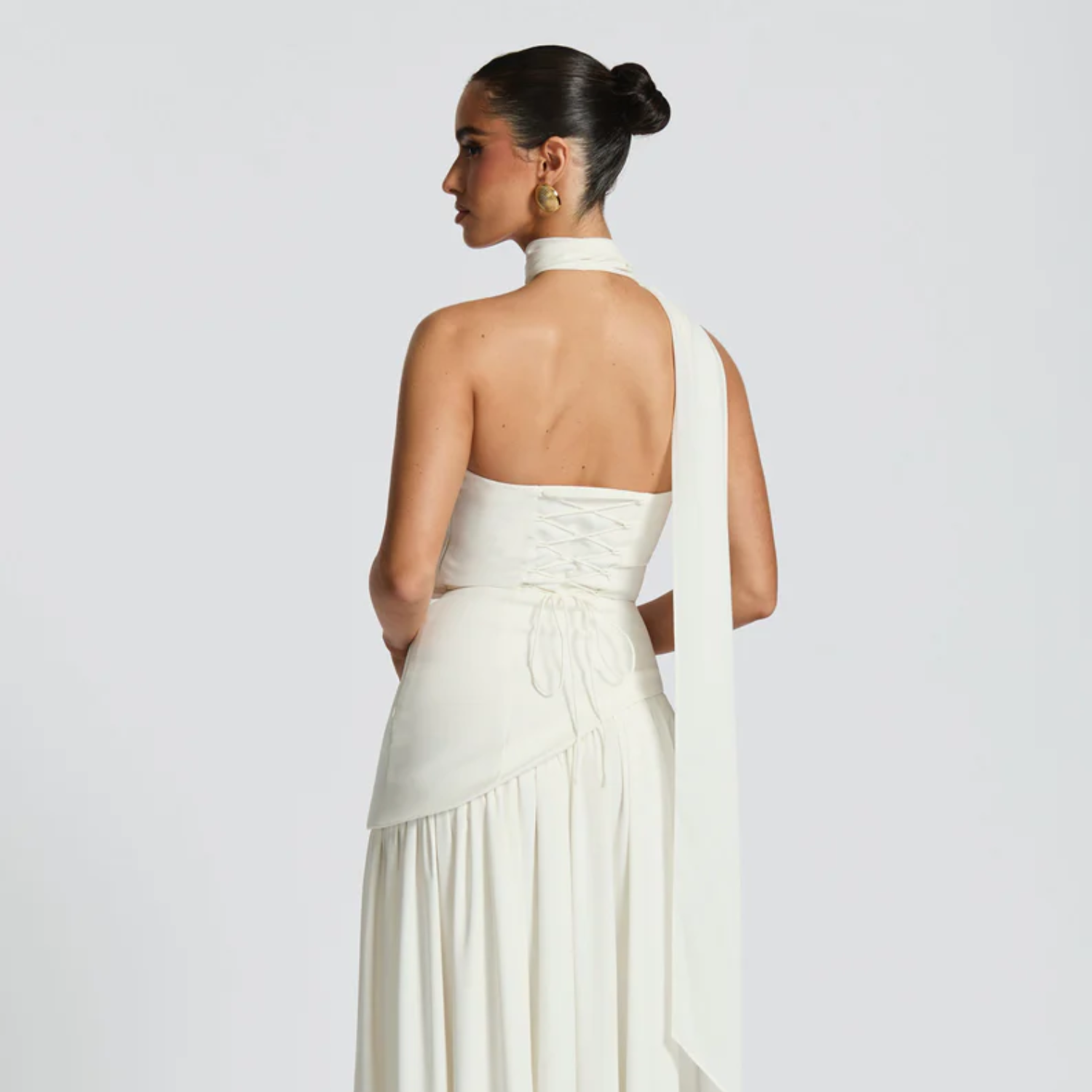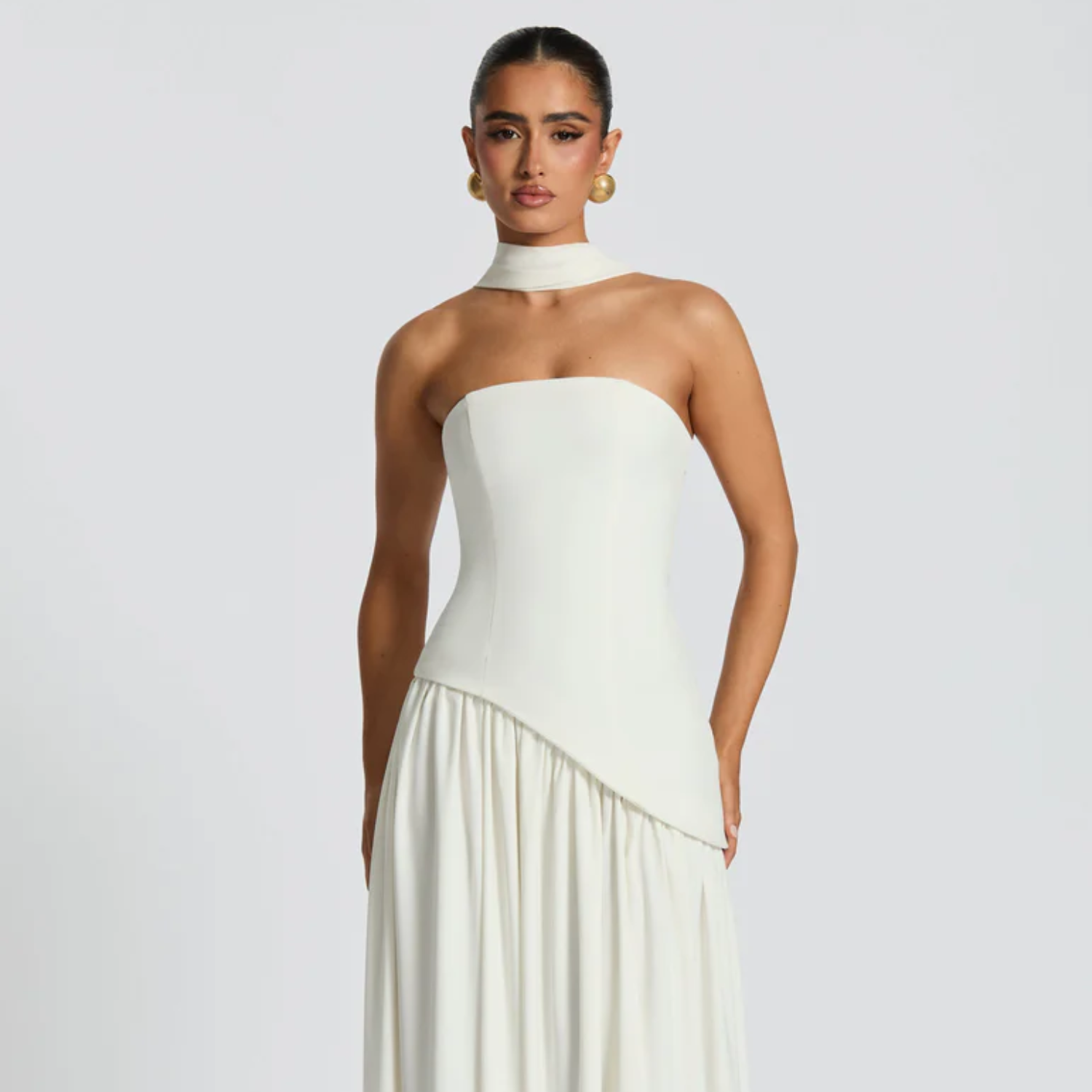 The Praia Dona Ana Dress is the definition of quiet magnetism. Designed in a soft ivory tone that feels timeless and luminous, this piece drapes the body with intention fluid where it should flow, sculpted where it should define. The silhouette elongates the frame, creating a clean vertical line that feels instantly elegant, while subtle shaping through the bodice enhances natural curves without stiffness. Every detail feels considered, from the way the fabric skims the body to how the length moves effortlessly as you walk.