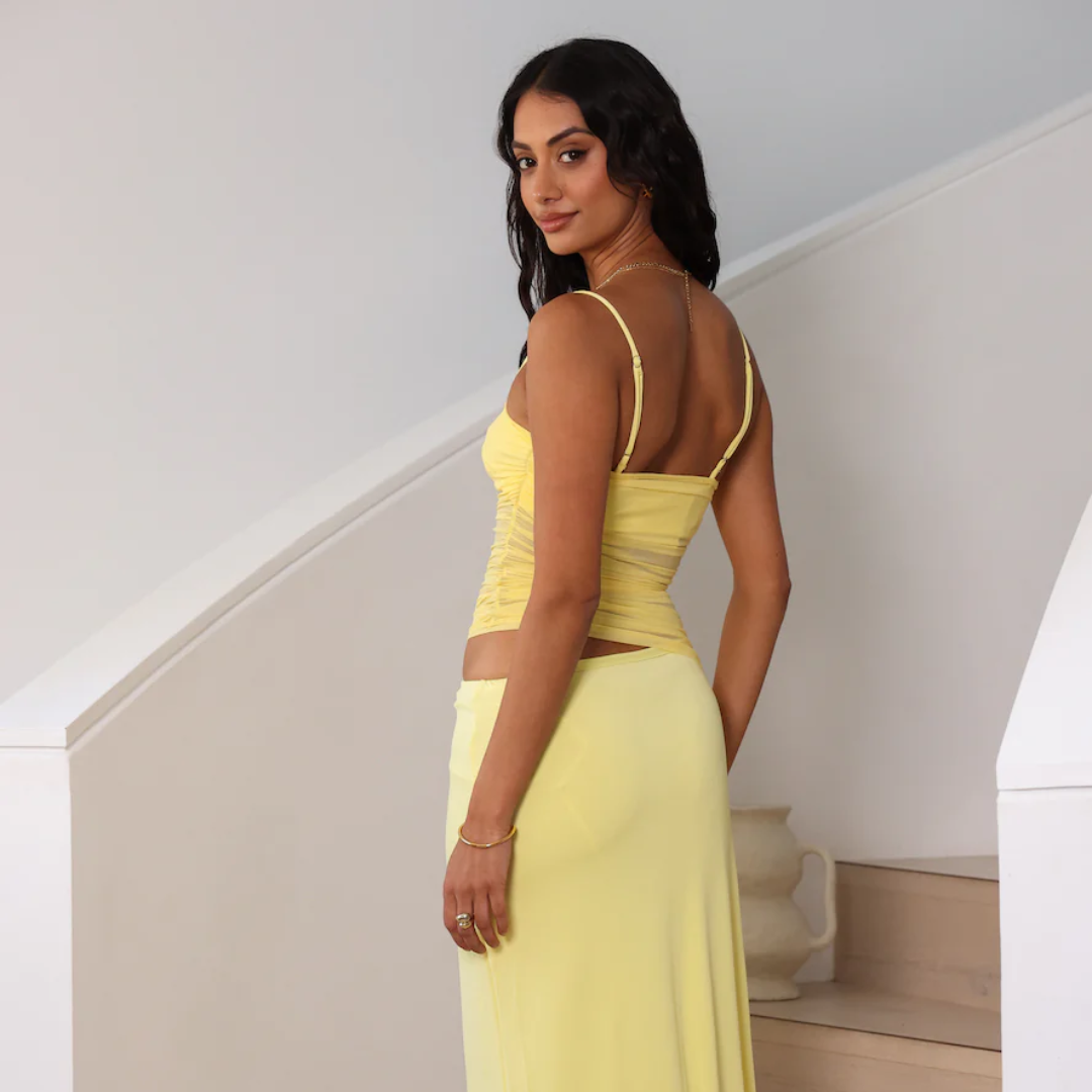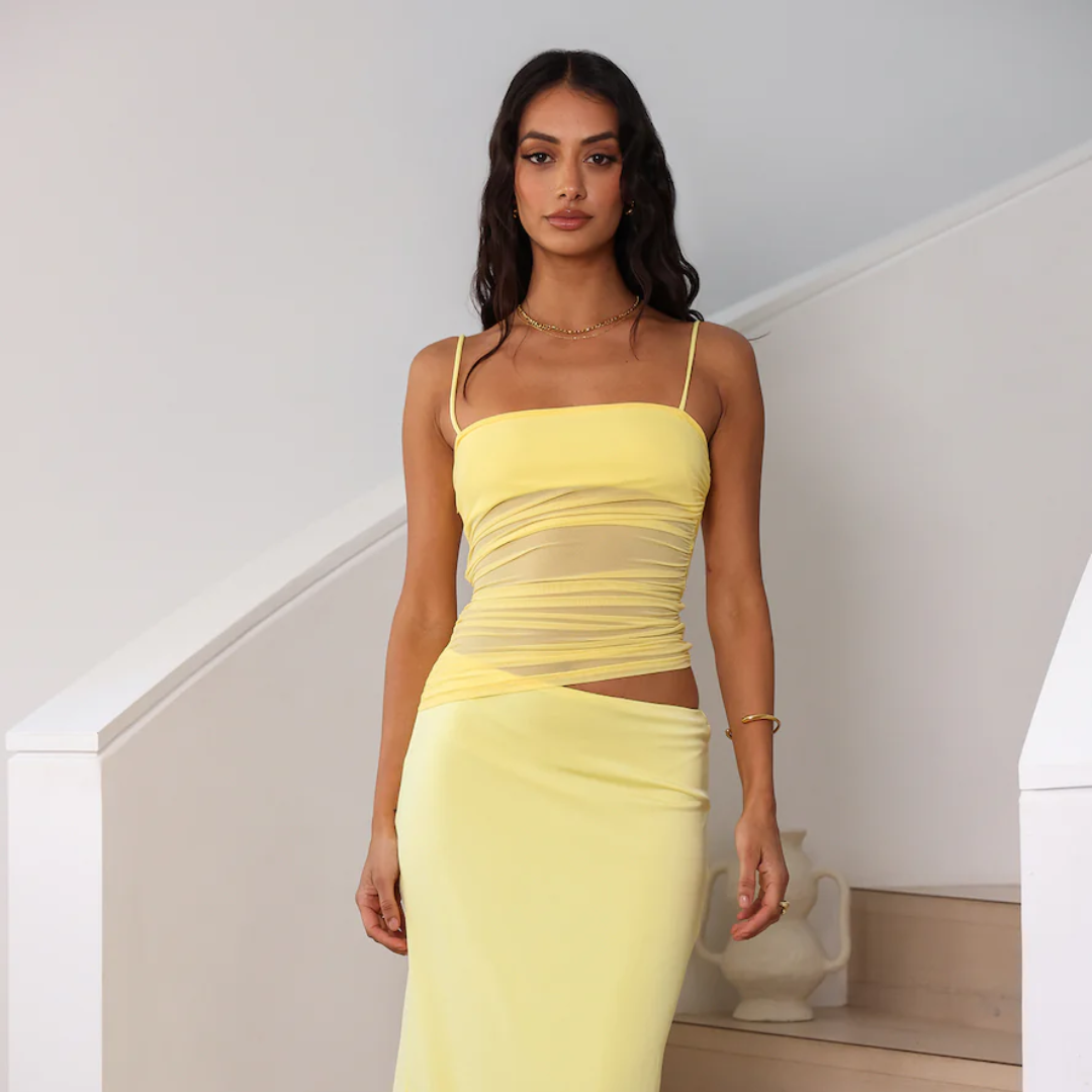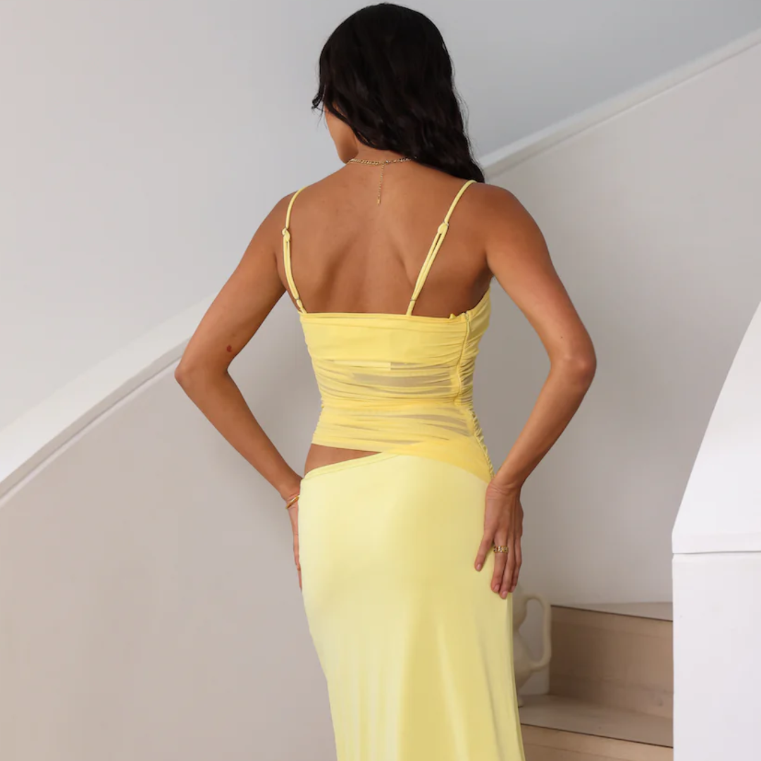 Ethereal and timeless, the Citrus Maxi Dress is designed to captivate. The layered mesh fabric creates a weightless feel, offering soft structure while maintaining fluid movement. Its romantic yellow hue enhances the dress’s dreamy quality, making it perfect for daytime events that transition seamlessly into evening. This is elegance reimagined light, expressive, and unforgettable.