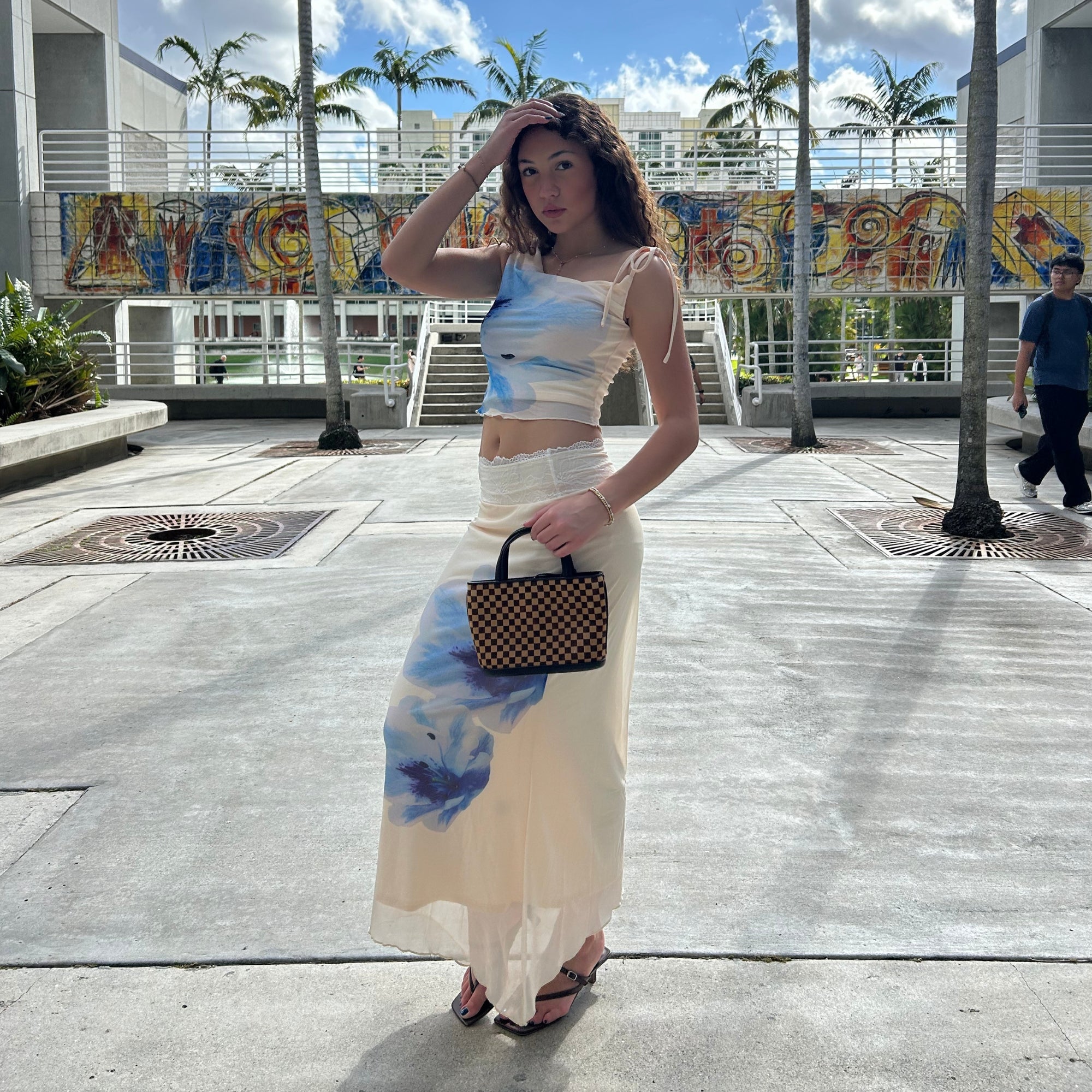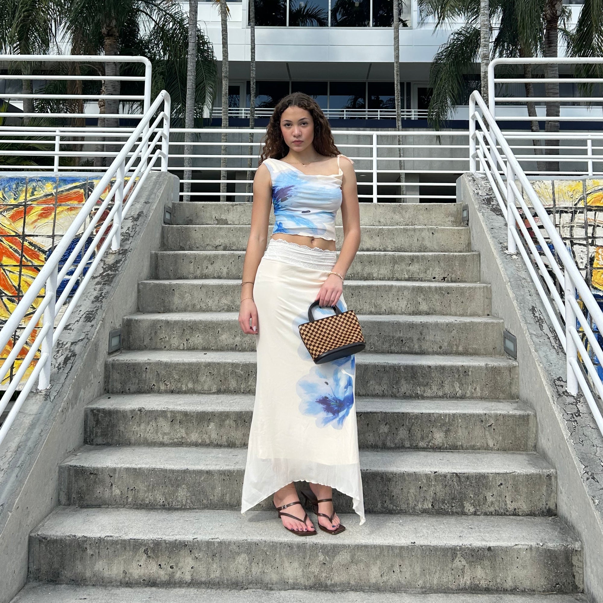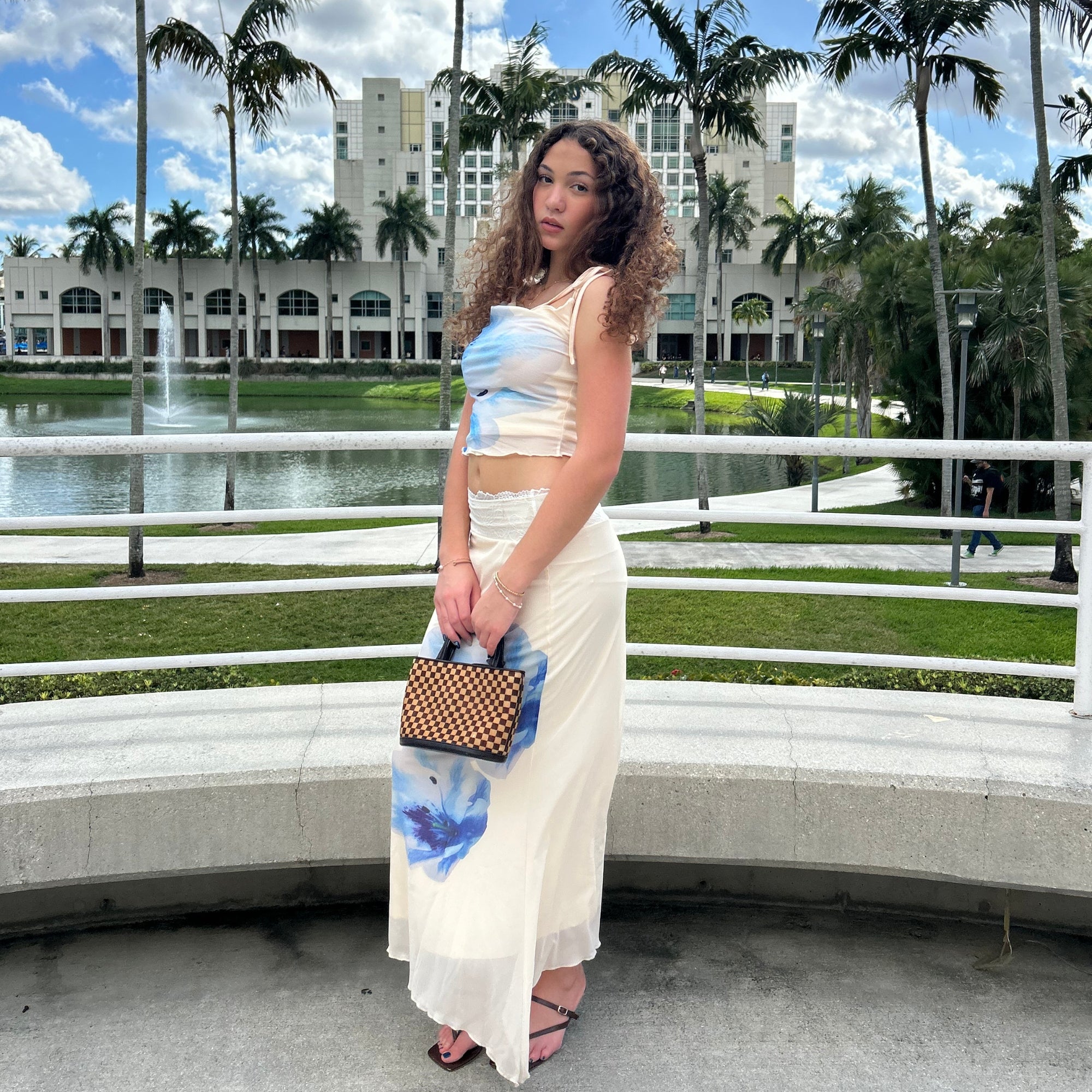 The La vanda Set is fully lined for added comfort and opacity. The floral print in white cream tones brings a delicate, garden inspired aesthetic that’s easy to match with neutrals or pastels. The waist is designed to sit naturally and gently ease into fuller movement below, creating flattering folds and fluid motion.