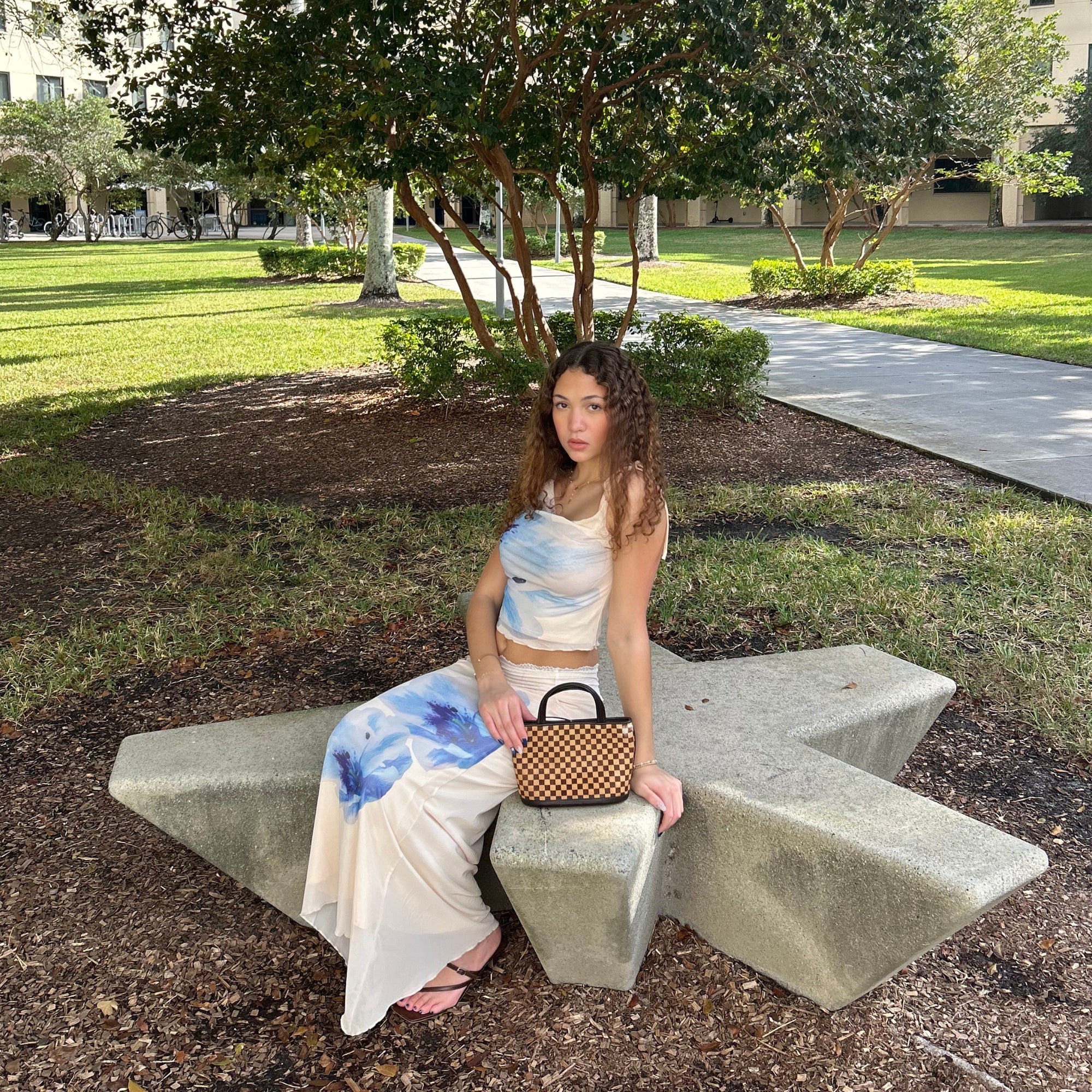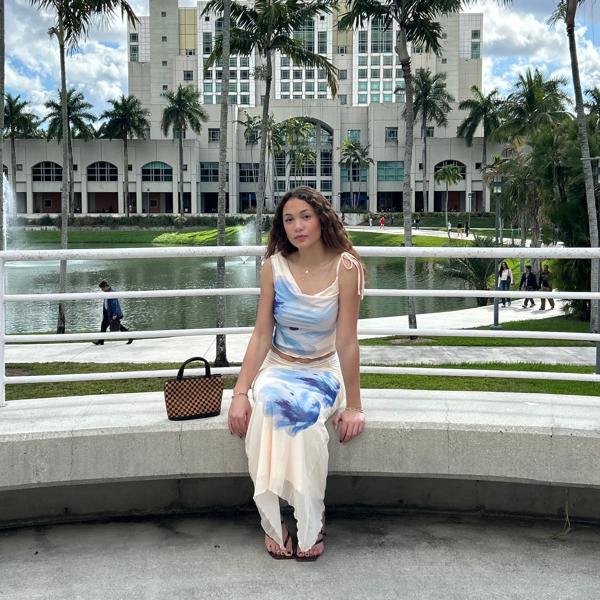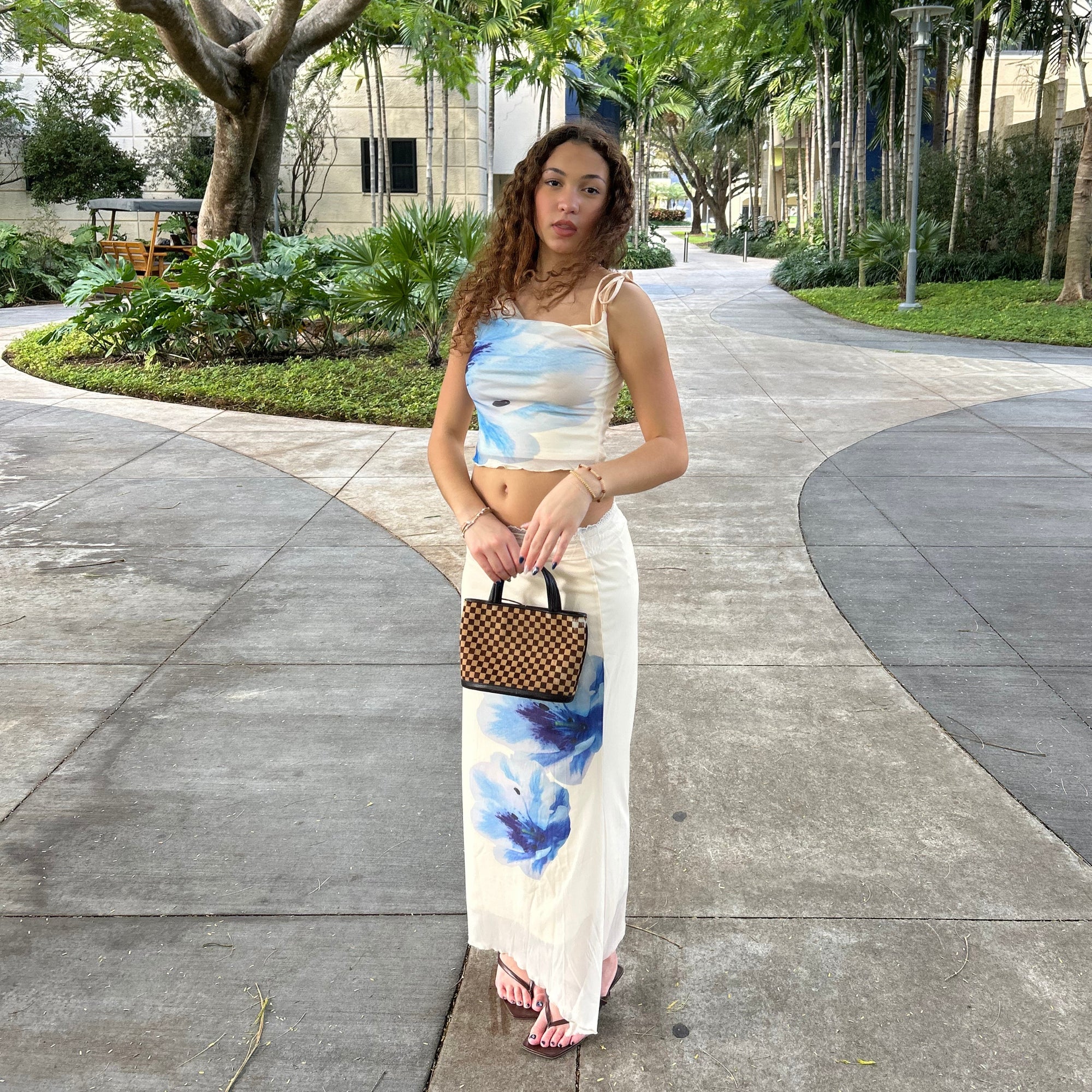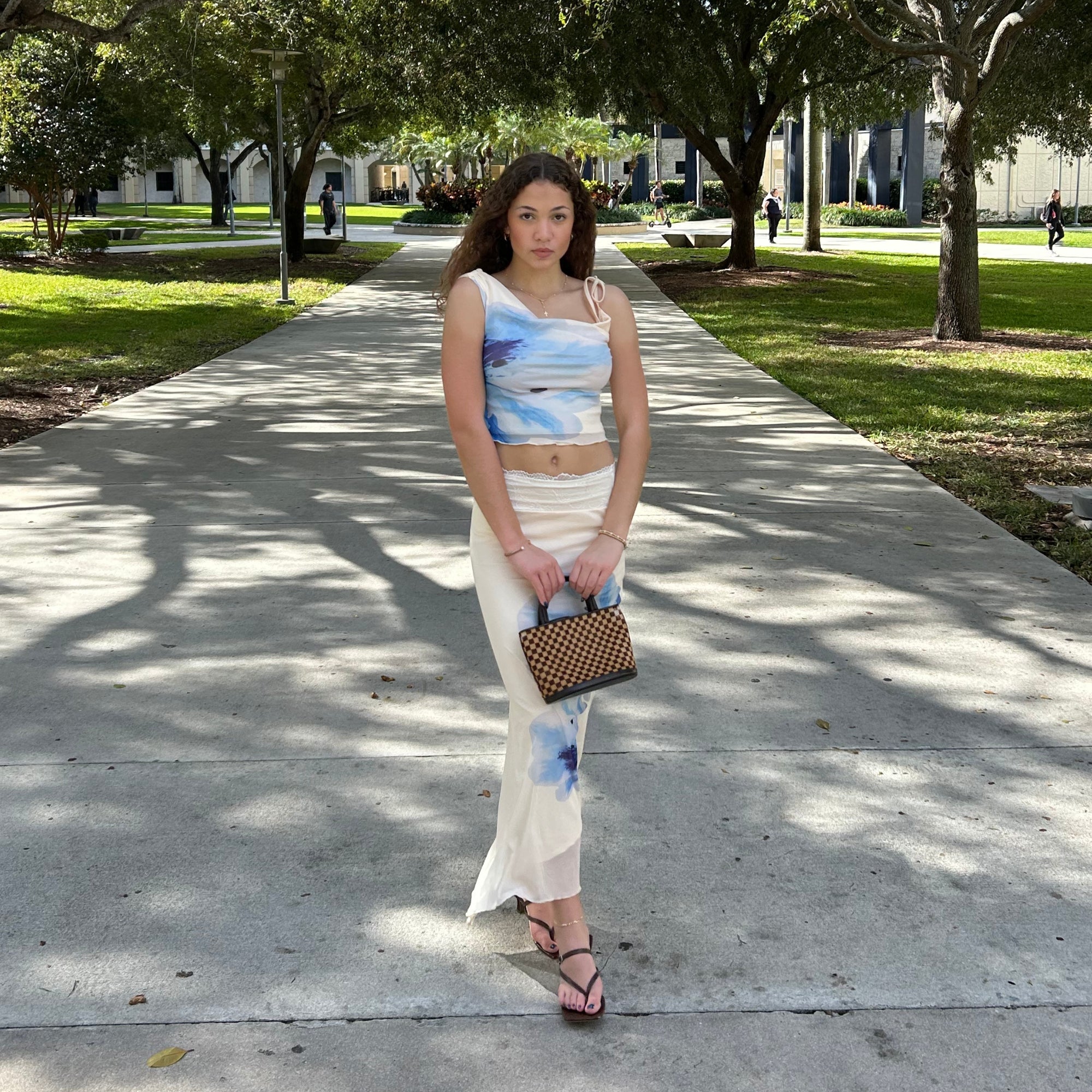 The La vanda Set is fully lined for added comfort and opacity. The floral print in white cream tones brings a delicate, garden inspired aesthetic that’s easy to match with neutrals or pastels. The waist is designed to sit naturally and gently ease into fuller movement below, creating flattering folds and fluid motion.