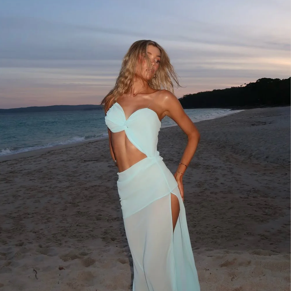 Two piece design made from lightweight chiffon fabric with a semi sheer finish. The top includes a twist front bandeau style with soft ruching and a secure elastic fit. The dress is an asymmetrical maxi length with a high slit and low rise waistband, offering a flowy drape and comfortable movement. The set is unlined, breathable, and designed to flatter the waist and hips.