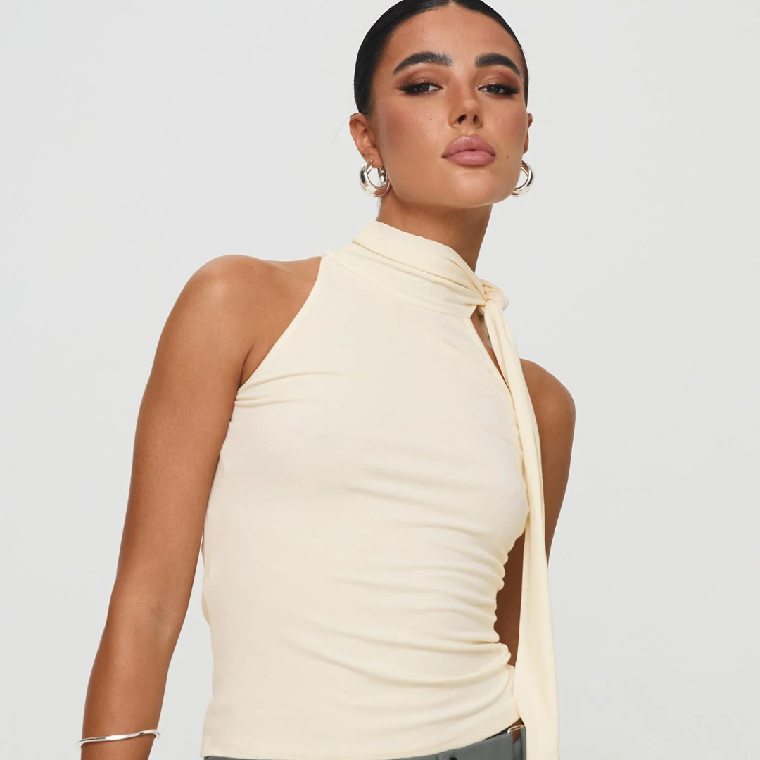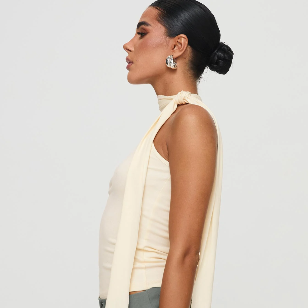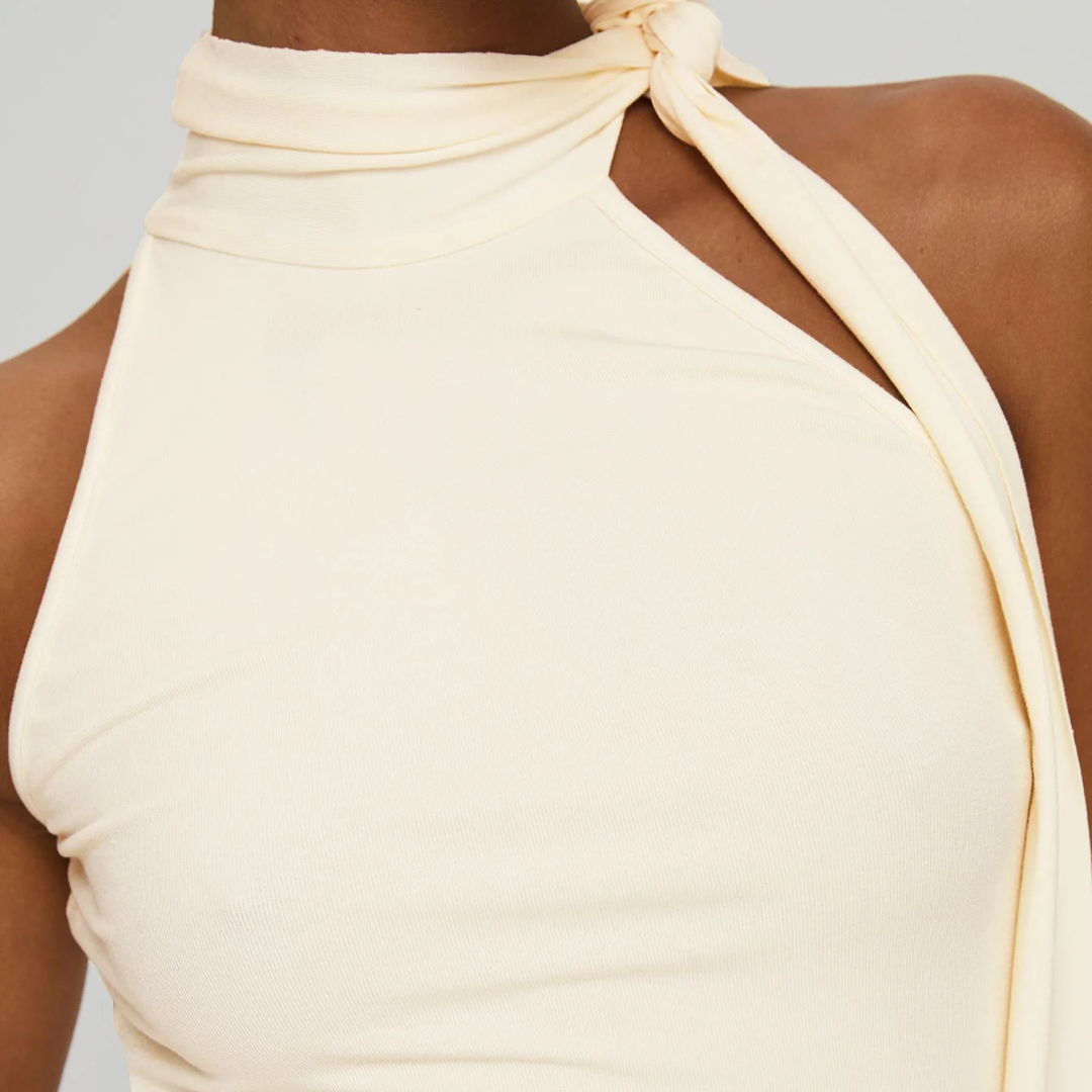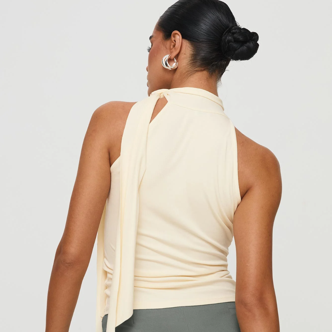 Designed with a high neckline and softly sculpted sleeveless silhouette, the Meridian Formal frames the upper body with quiet confidence and grace. The delicate side tie introduces a touch of movement and modernity, offering fluid contrast to the top’s clean lines.