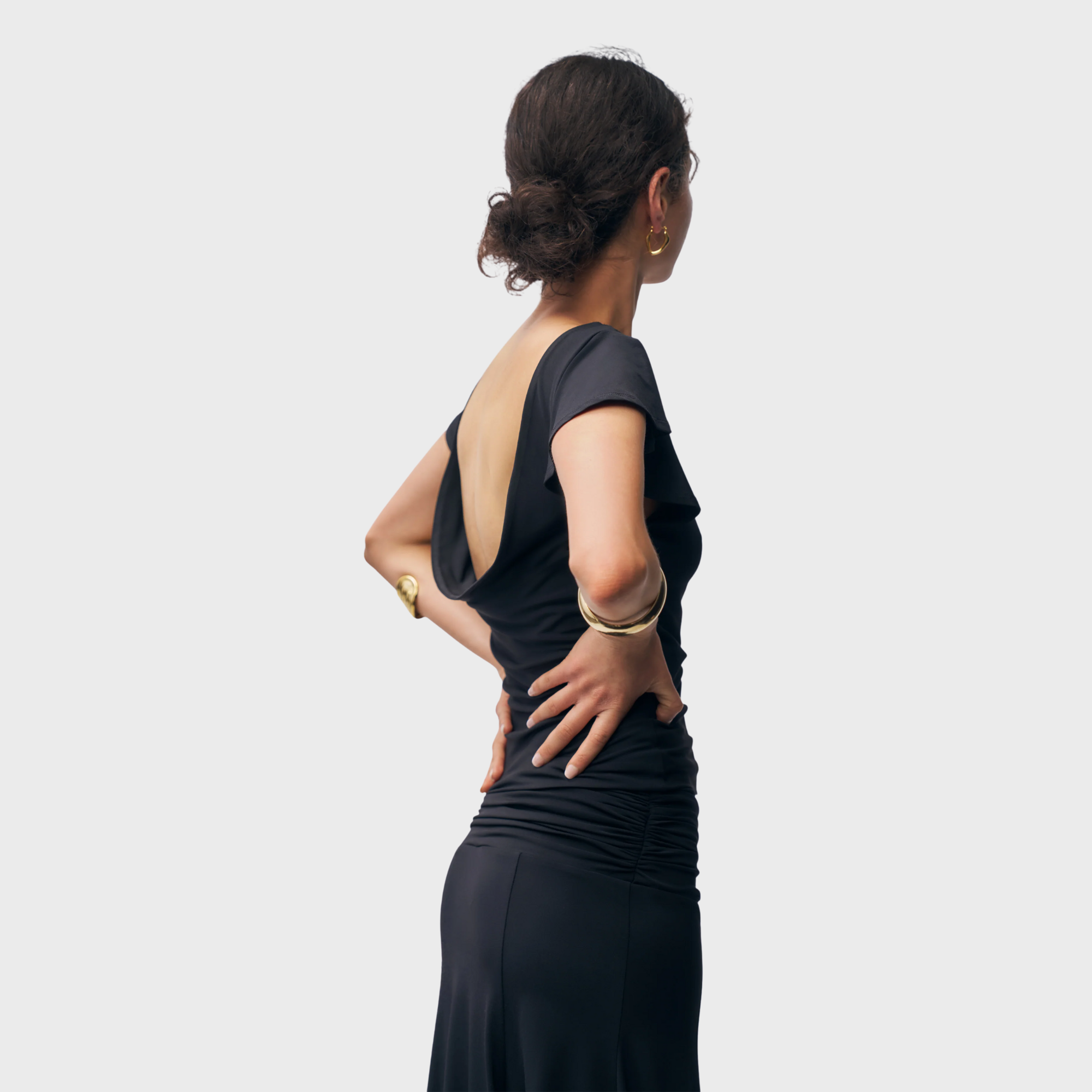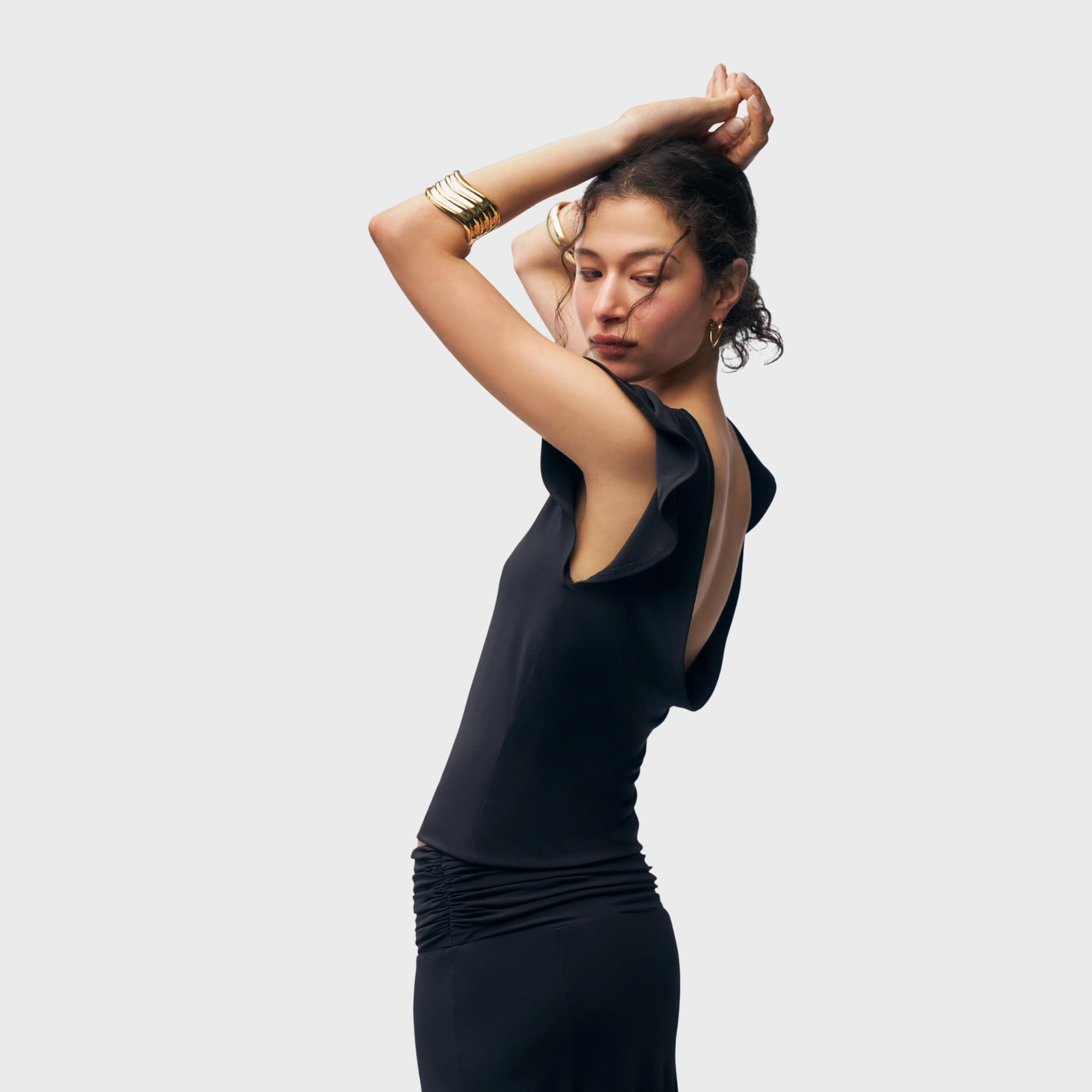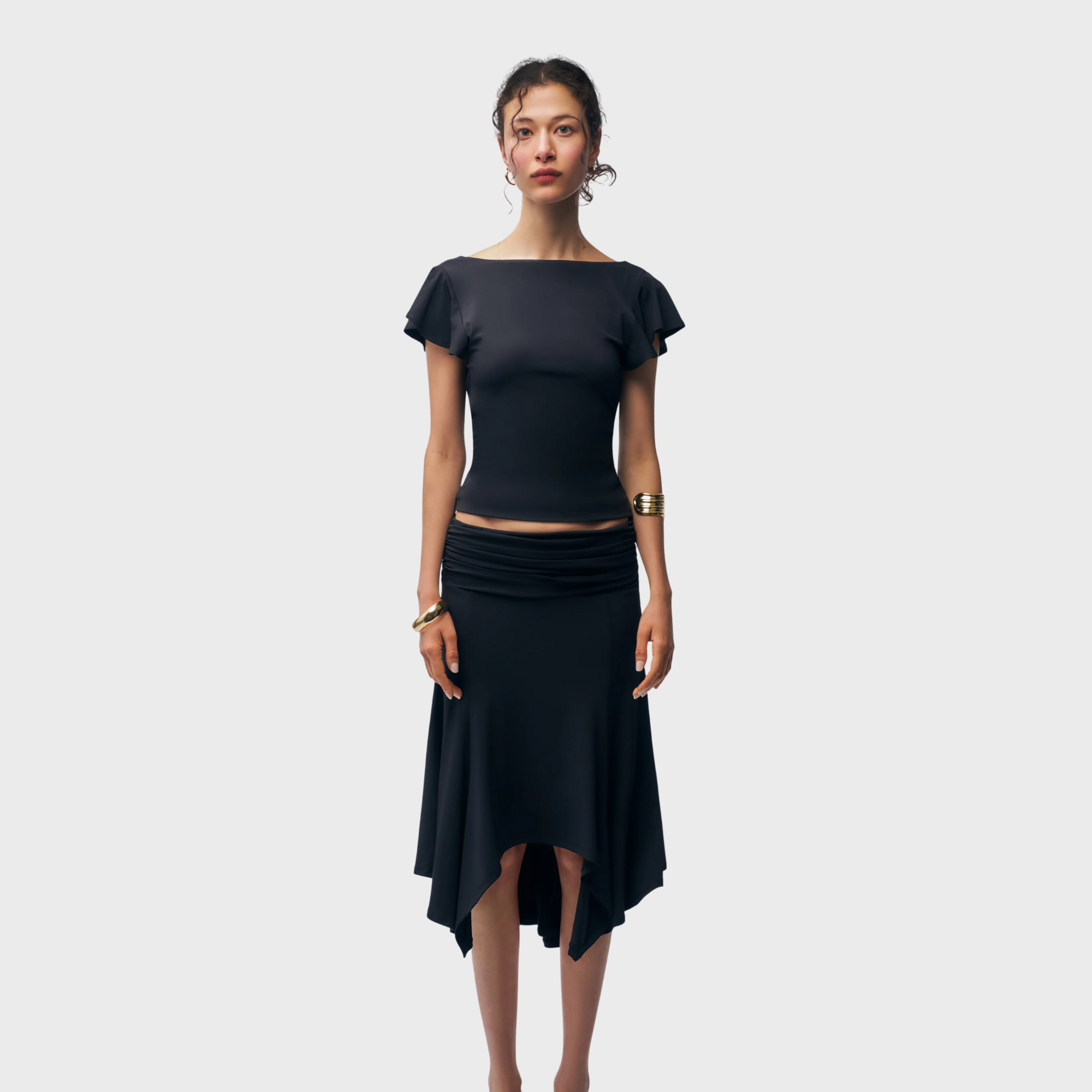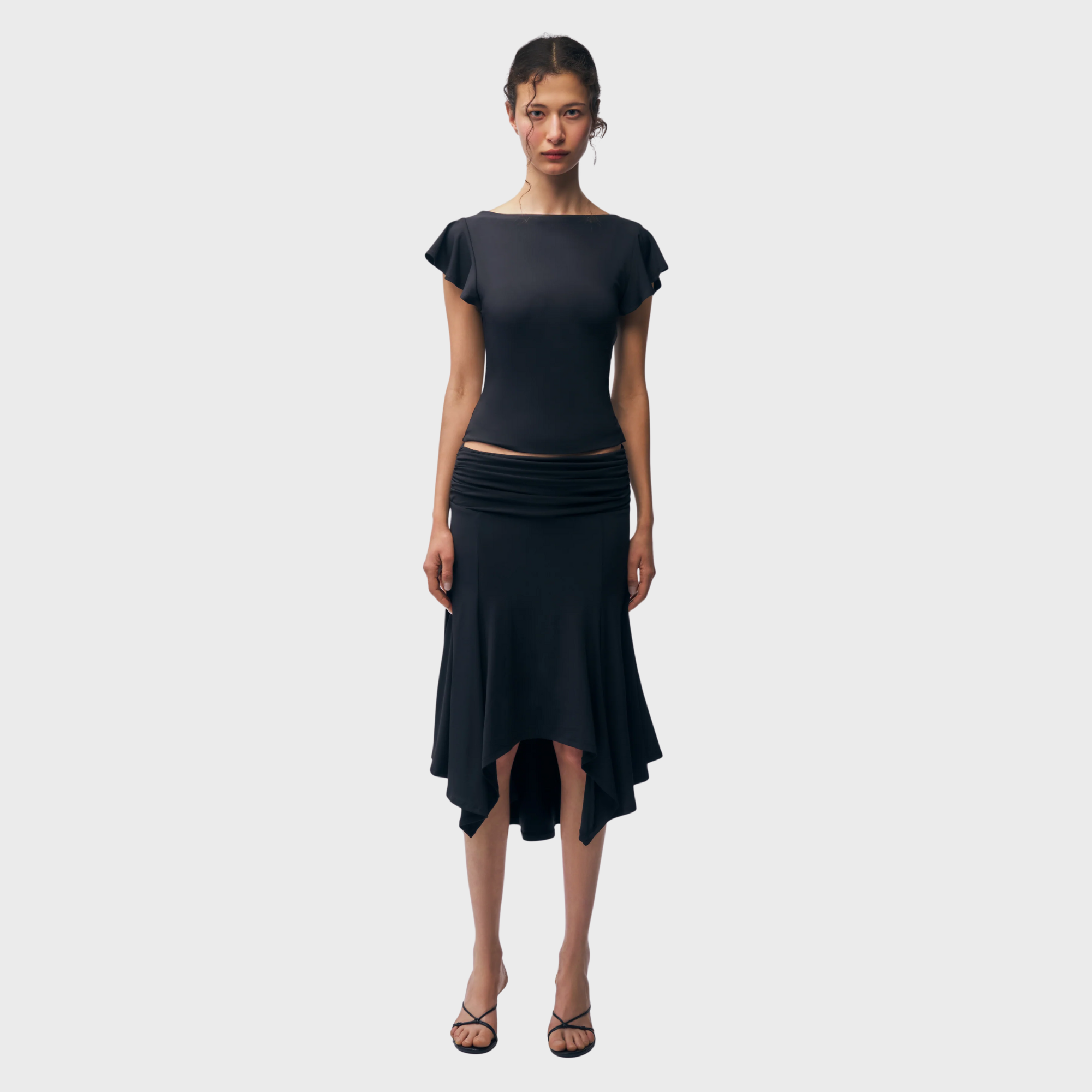 The Eclipse Midi is designed for nights that demand subtle drama. Its soft, flowing fabric cascades gracefully with every step, while the high rise fit flatters the waistline. Minimalist yet striking, this skirt captures the perfect balance of elegance and edge, making it ideal for rooftop parties, intimate dinners, or gallery openings.
