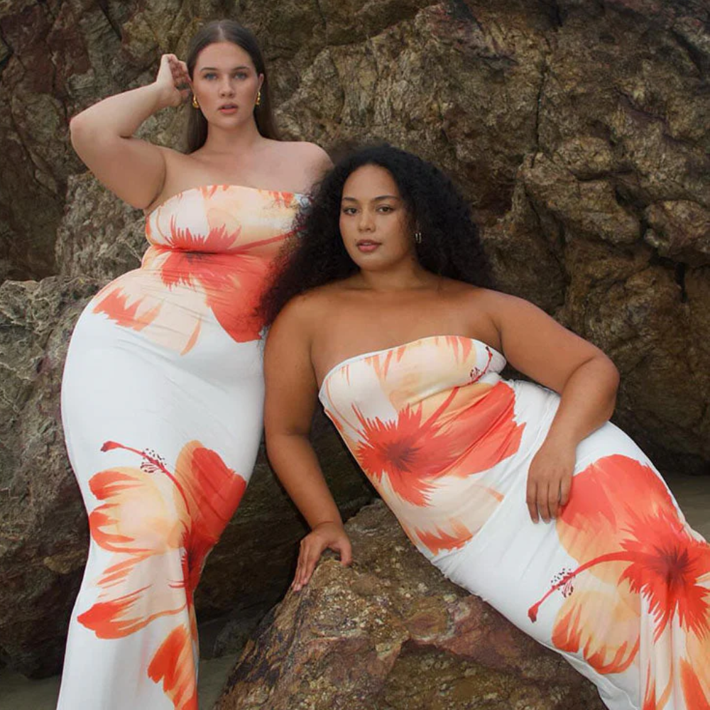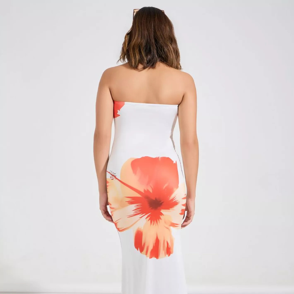 Sunset Hibiscus Body Con is a summer essential that effortlessly blends elegance with playful charm. Crafted from soft, slinky jersey fabric, it drapes beautifully over the body while maintaining a sleek silhouette. The chic bandeau neckline frames the shoulders, adding a subtle hint of allure, while the delicate white floral print brings a fresh, feminine touch. Its flowing maxi length ensures graceful movement with every step, making it perfect for garden parties, sunset dinners, or warm weather getaways.