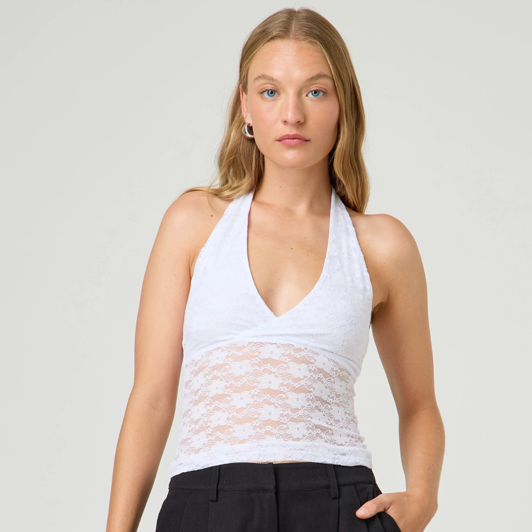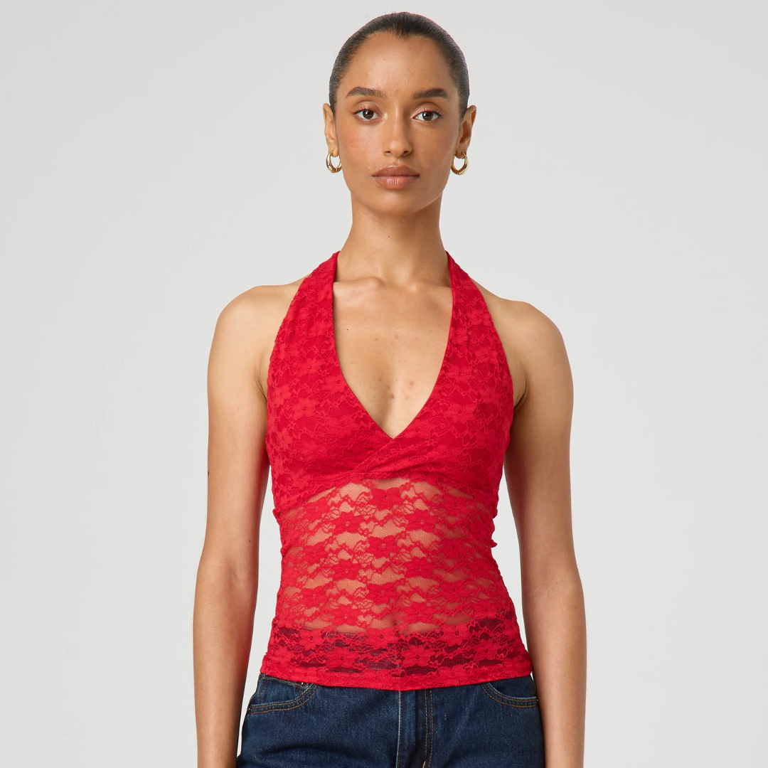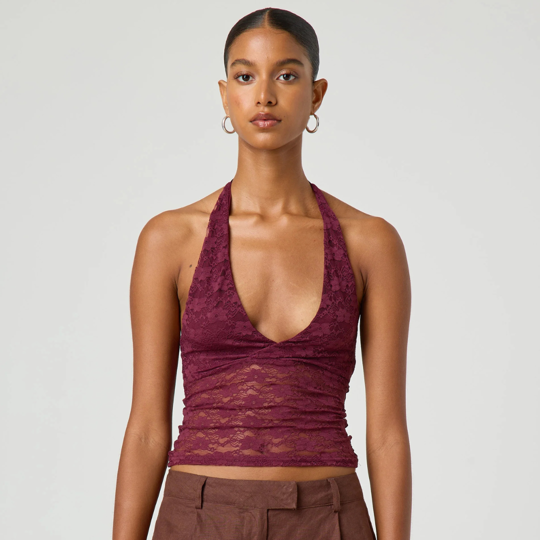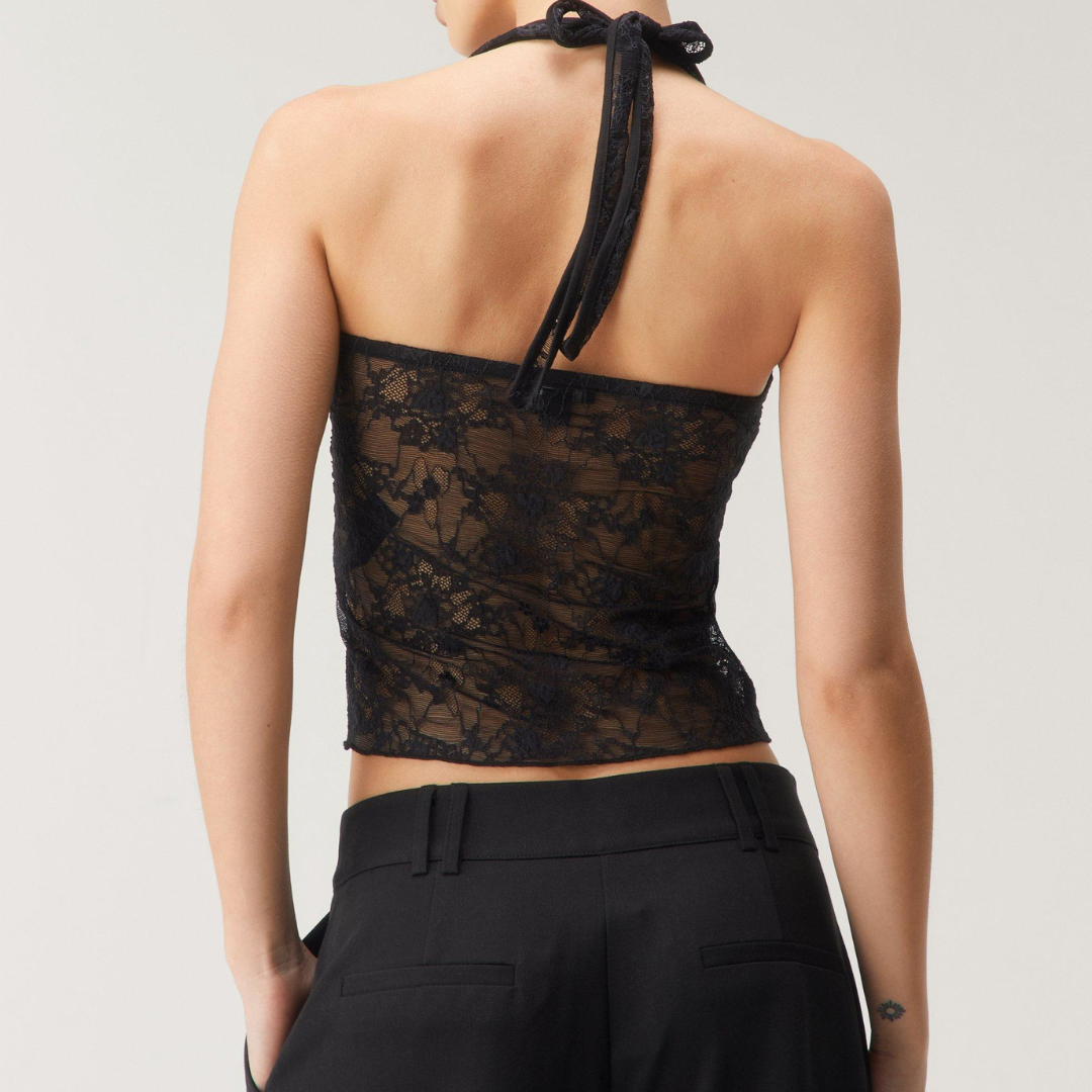 Crafted from delicate semi sheer lace with a lined bust, Coral Lace offers just the right amount of coverage while maintaining a lightweight, airy feel. The flattering V neckline is paired with a fixed halter strap, creating a sleek silhouette that draws attention to the shoulders and collarbone.
