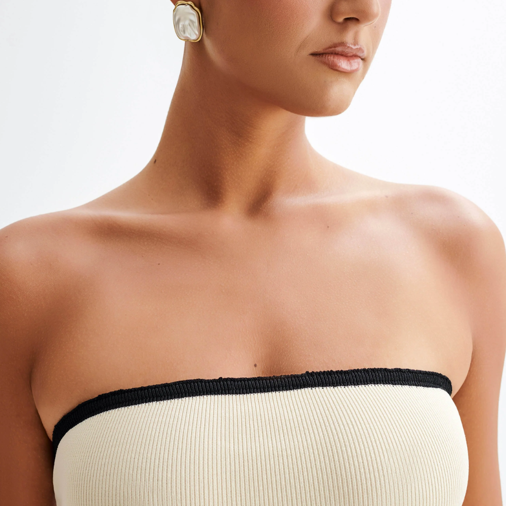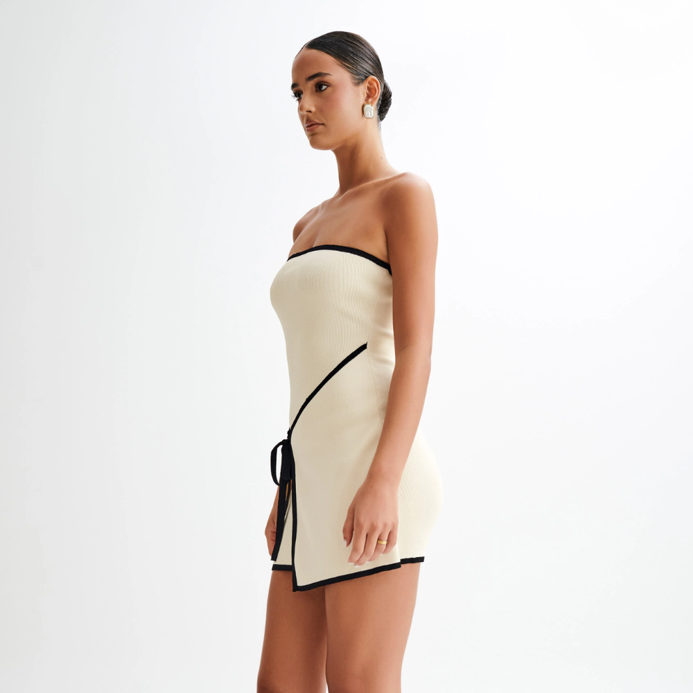 Designed in a creamy neutral that pairs effortlessly with bold accessories or minimal styling, the Isla Mini Dress highlights your shoulders and neckline with a clean, strapless silhouette. A soft knit body hugs your frame while an oversized asymmetrical layer adds dimension and modern flair. The contrasting edge detail creates a subtle graphic finish that feels both sleek and elegant. A functional hip tie lets you cinch the waist for a more defined shape or loosen it for relaxed ease.