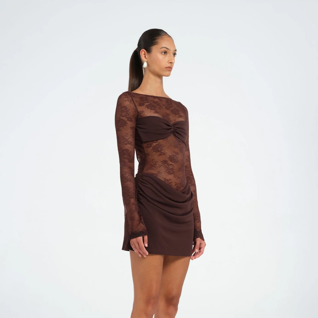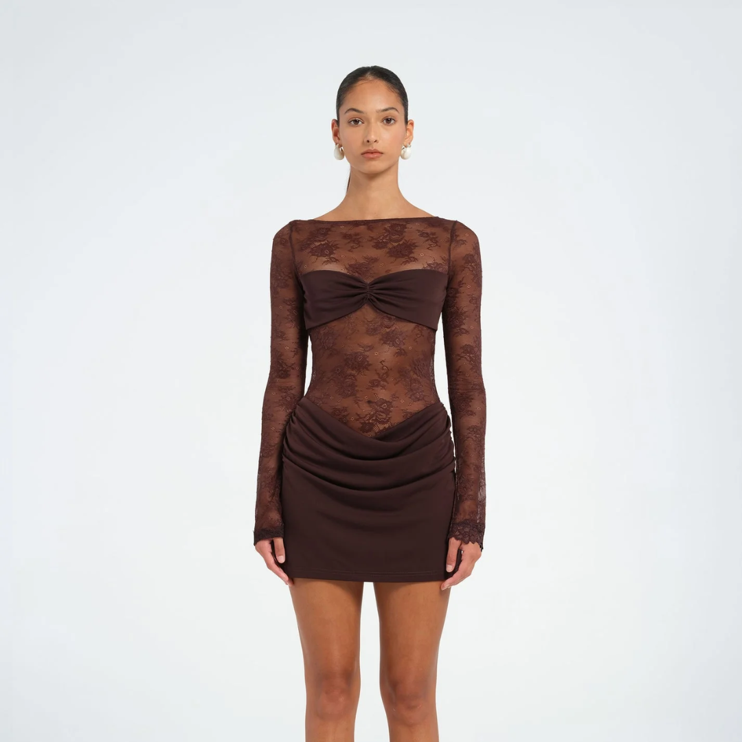 Seen in The City is a soft seductive, high taste piece designed to flatter with contrast and detail. Long sheer lace sleeves add delicate texture and subtle drama, balanced by a clean boat neckline that frames the collarbone with a refined touch. An overlapping bralette structure sits beneath the lace bodice, offering gentle support and a modern, slightly exposed feel. Made from a blend of soft jersey and fine lace, it wears comfortably while still looking polished and intentional.