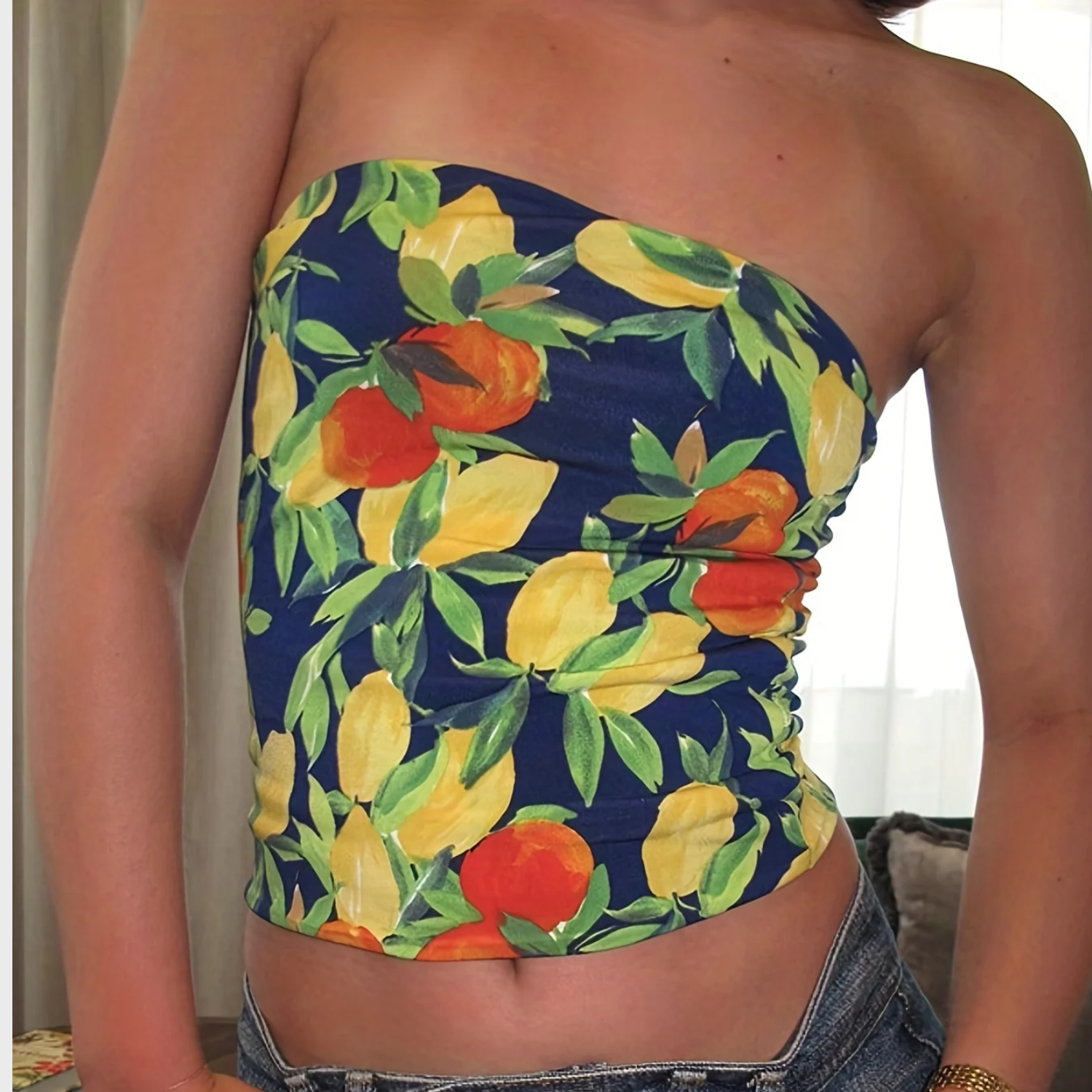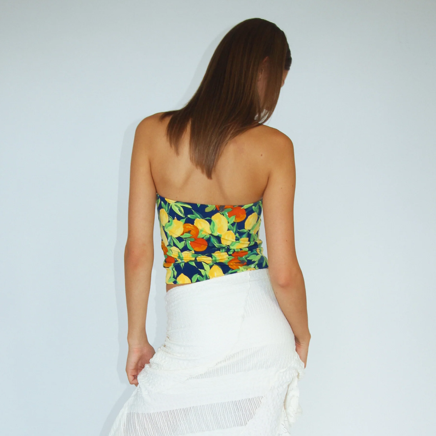 The Nectar Mood is vibrant lemon with floral print on a smooth, lightweight fabric that provides a soft, breathable feel with a straight neckline and a form hugging silhouette. The elasticized back ensures flexibility and easy wear, while the cropped length pairs perfectly with high waisted skirts or pants.