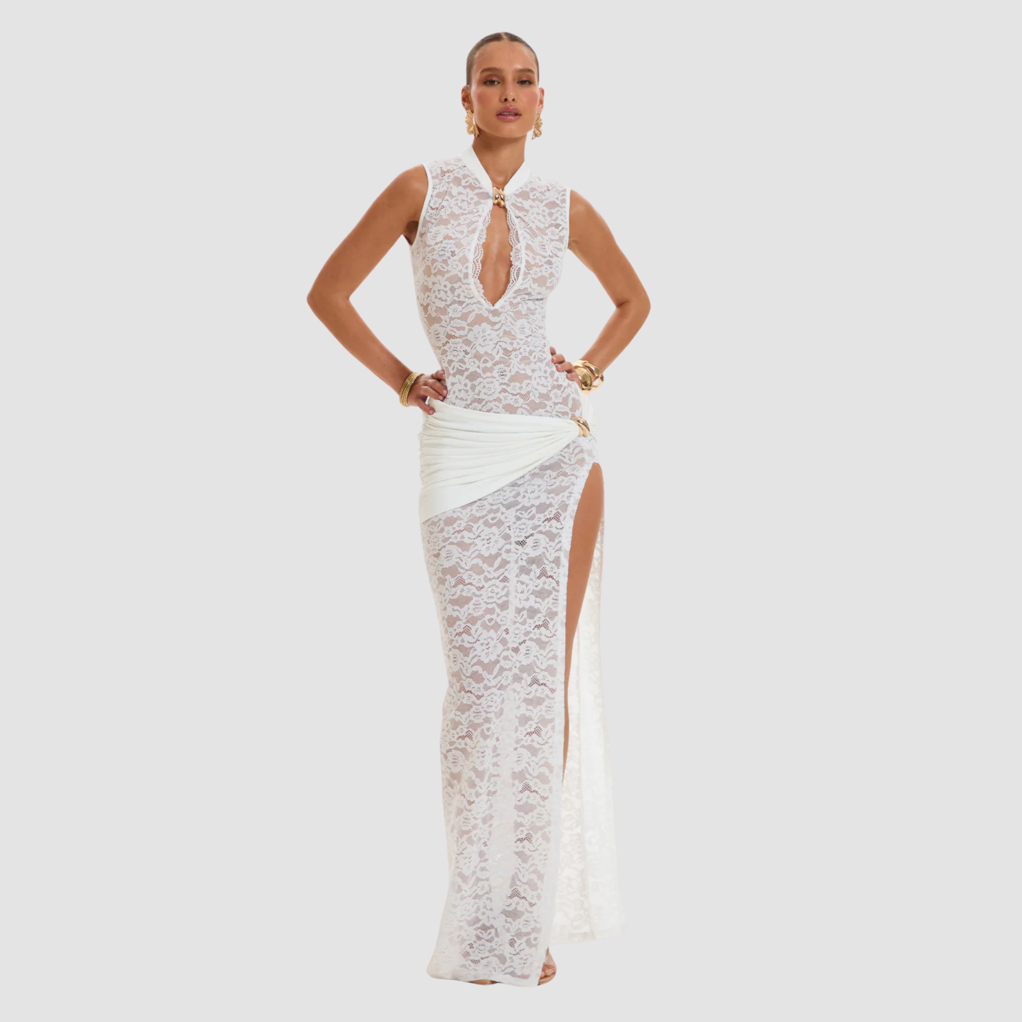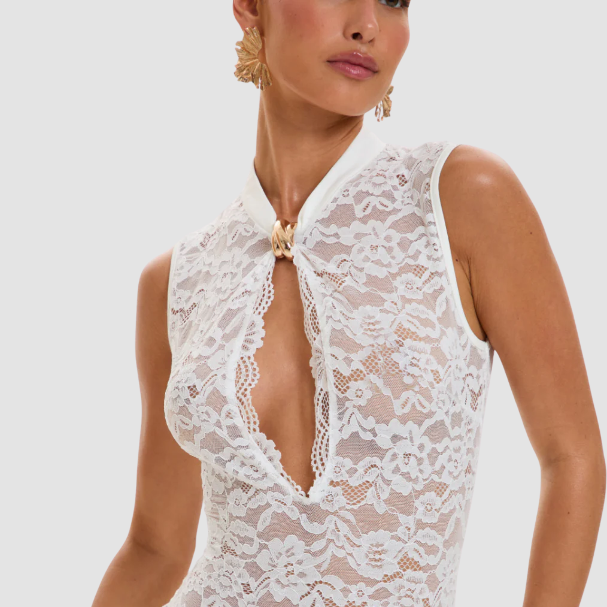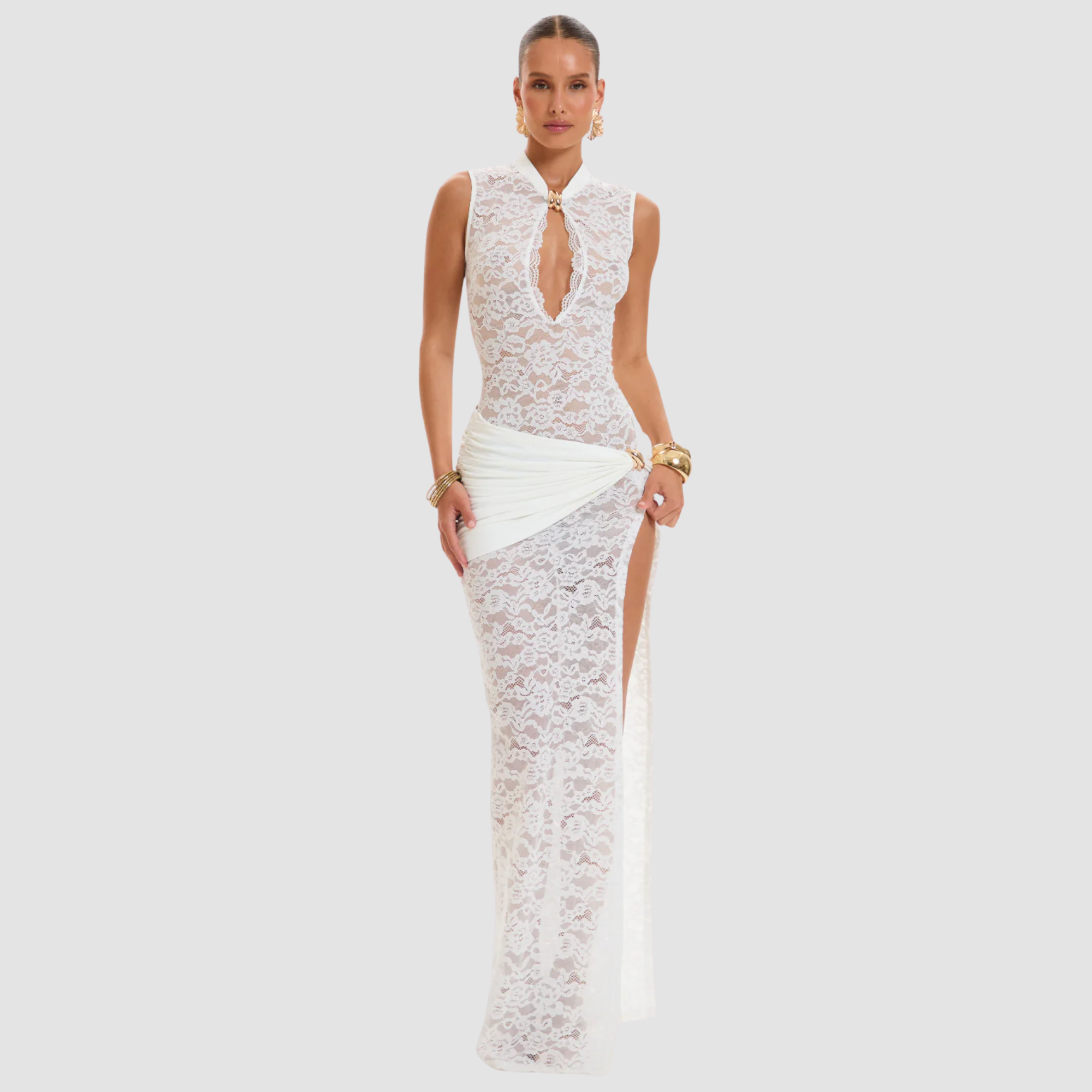 A dress carved from midnight itself sheer lace tracing the body in quiet, deliberate curves, balanced by a sculpted keyhole that feels both daring and impossibly refined. Its silhouette moves like a shadow slipping through candlelight, elegant and unafraid, created for nights where confidence is the only accessory you need.