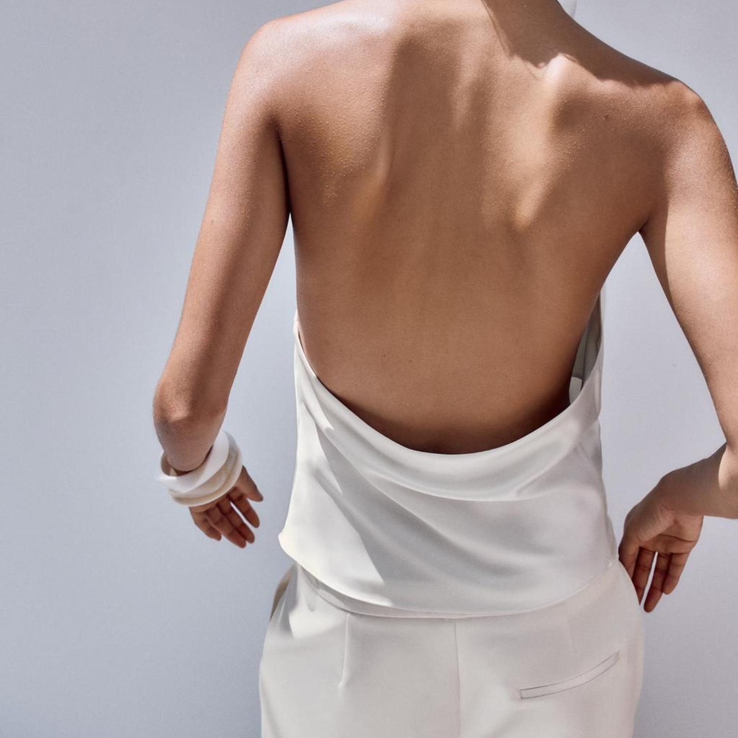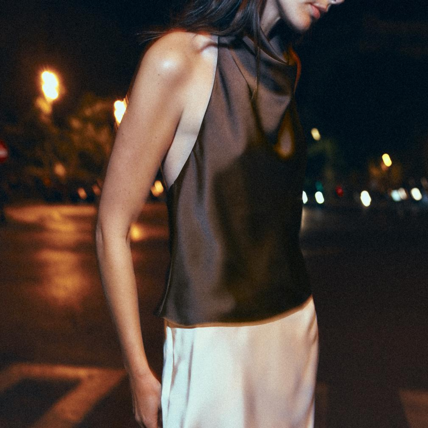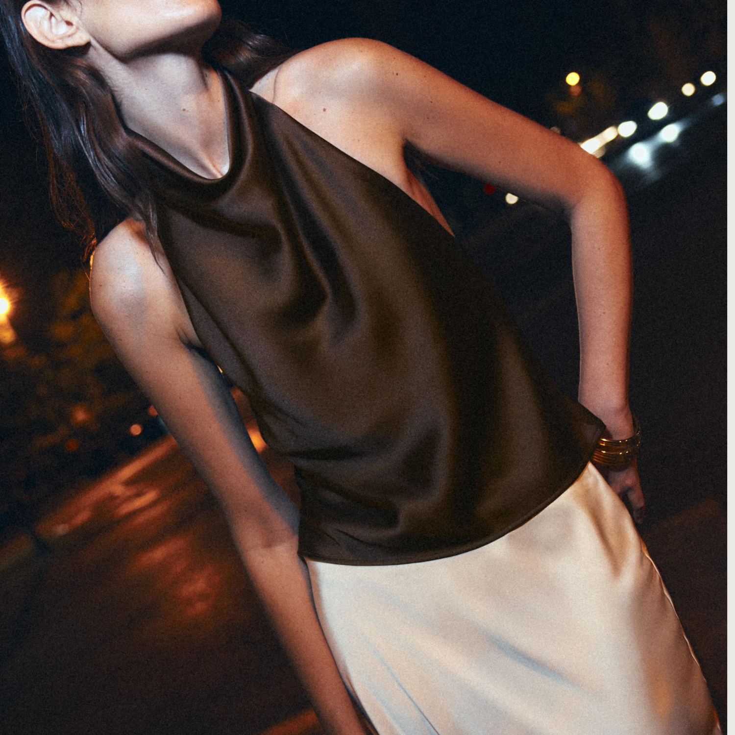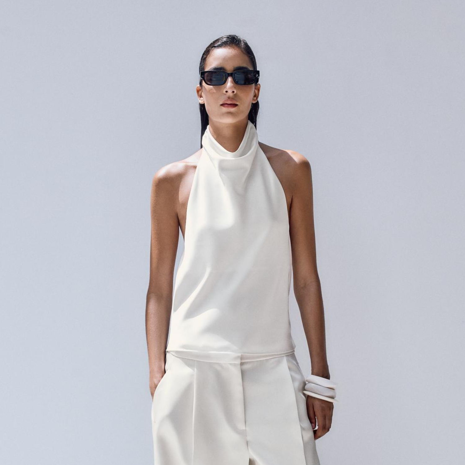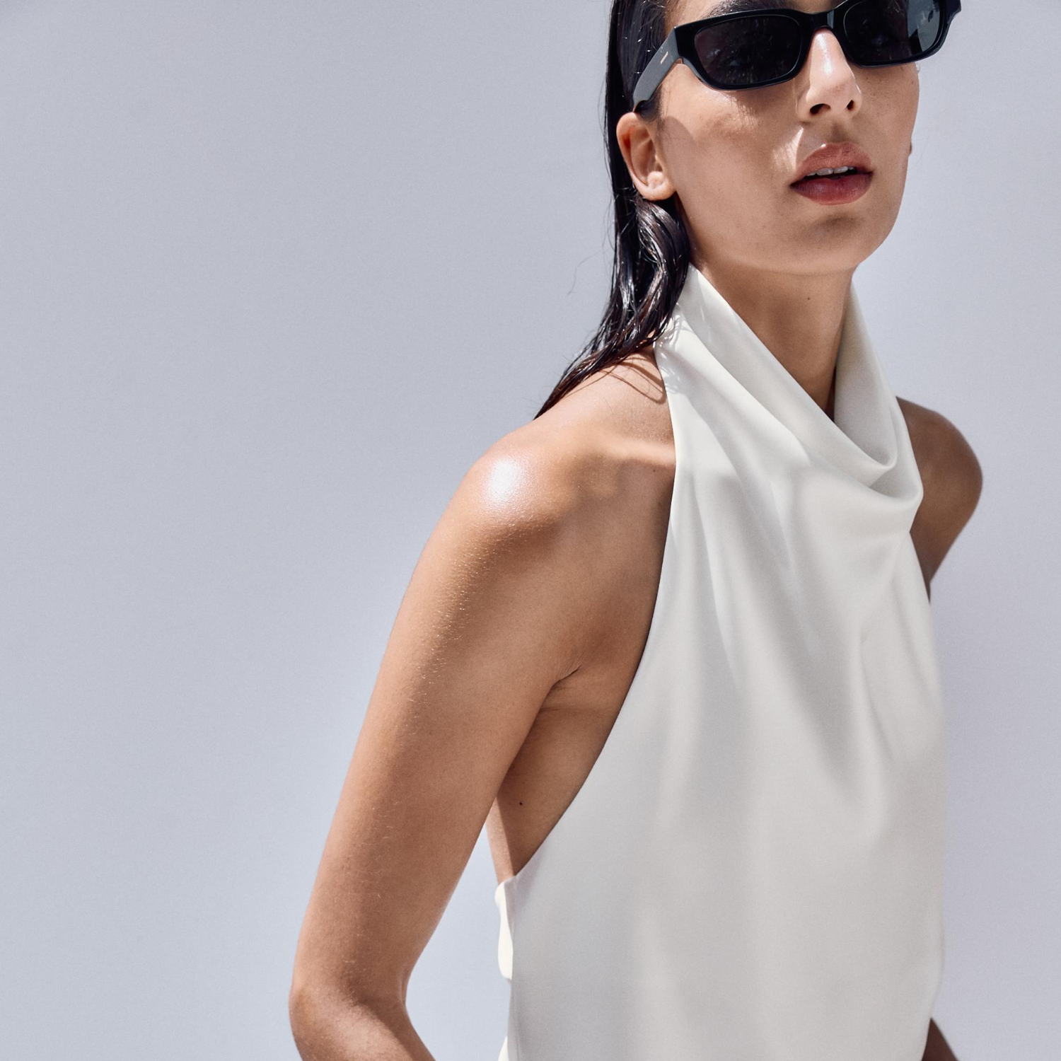 Polished, flattering, and effortlessly sleek, the Satin Drape Halter is made for moments that matter. The satin inspired finish catches the light with every movement, while the halter neckline creates a flattering frame for the shoulders. Its cropped, tailored fit pairs seamlessly with skirts, jeans, or trousers for versatile styling. Step out in confidence this top is a subtle showstopper.