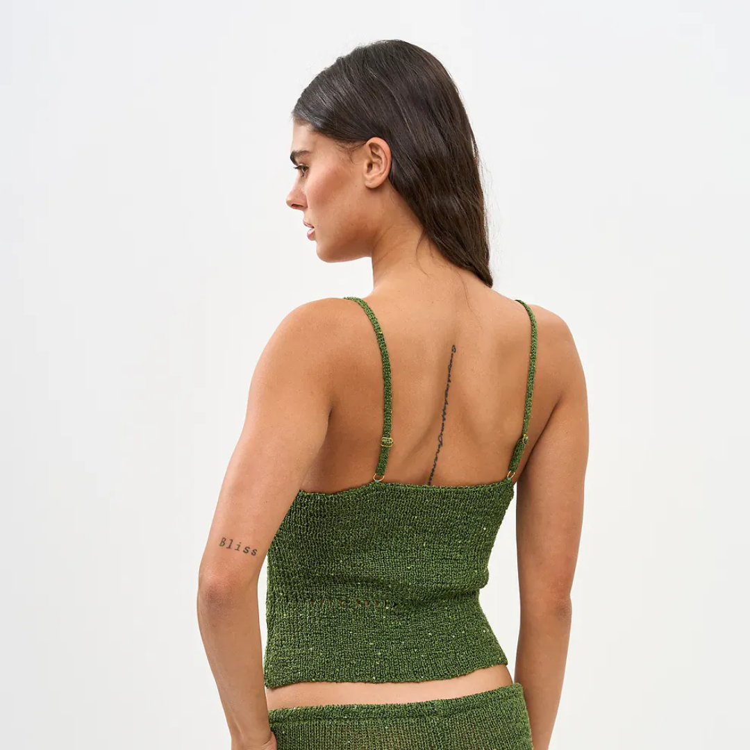 In richly toned jade, Ophira features a soft, stretch knit fabric that catches the light with subtle sheen. The plunging neckline is balanced by a delicate keyhole cut out and adjustable front ties, allowing for a customizable fit.