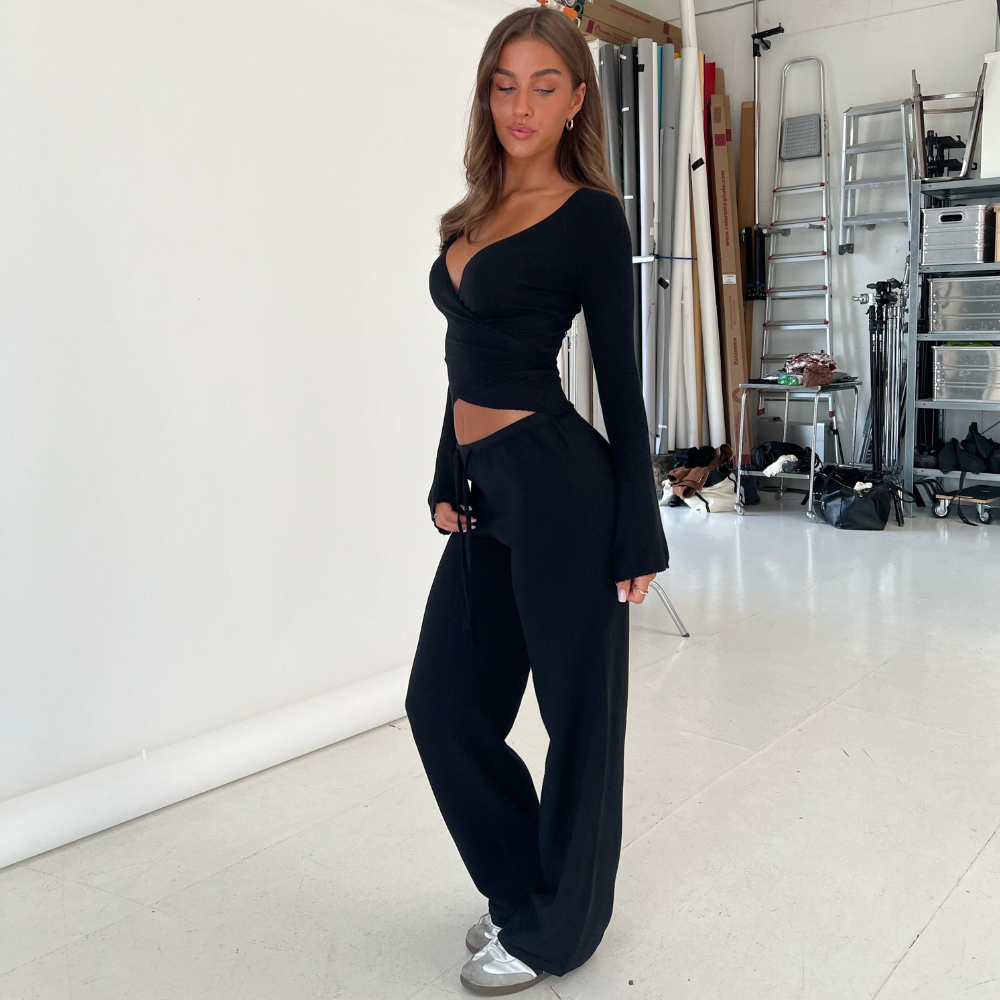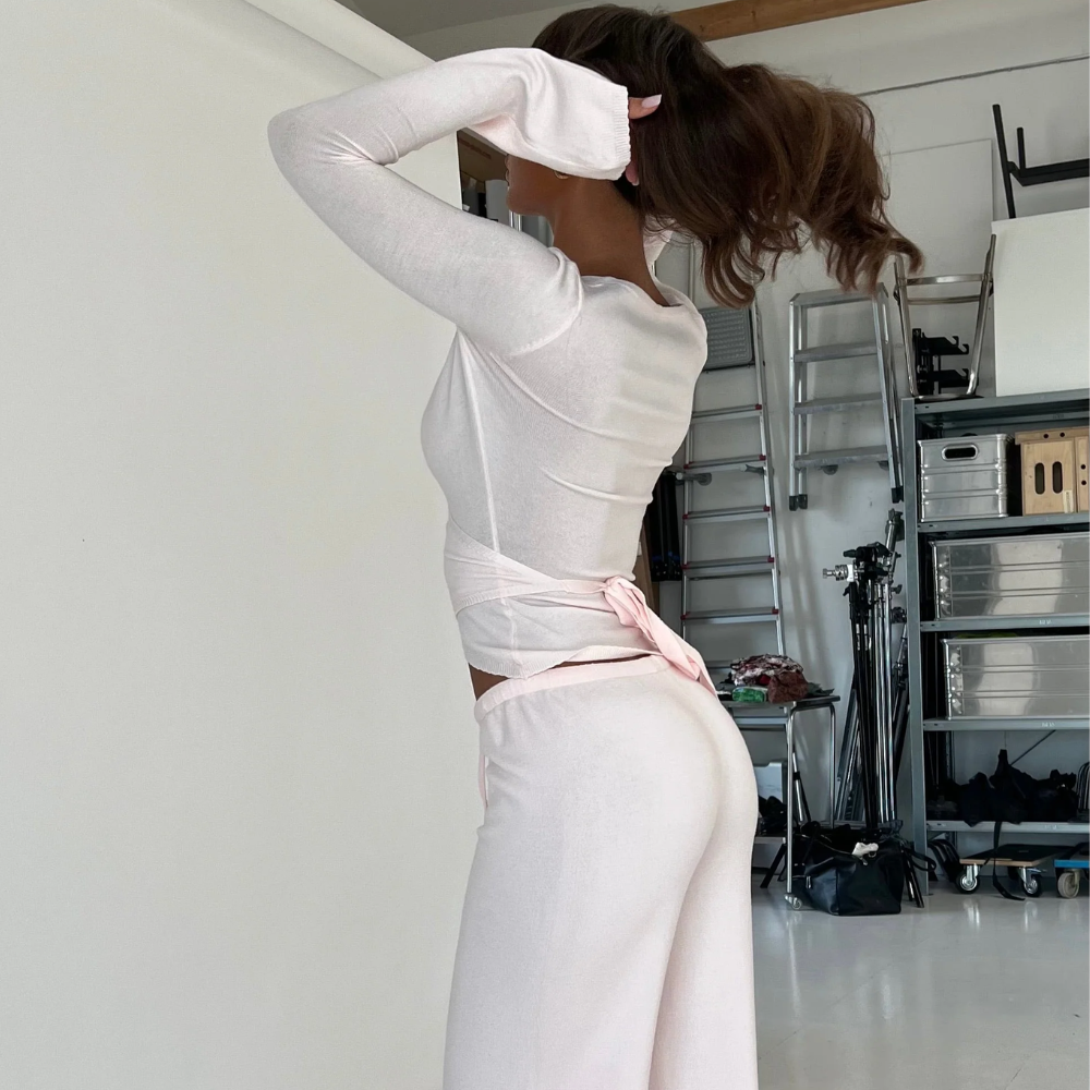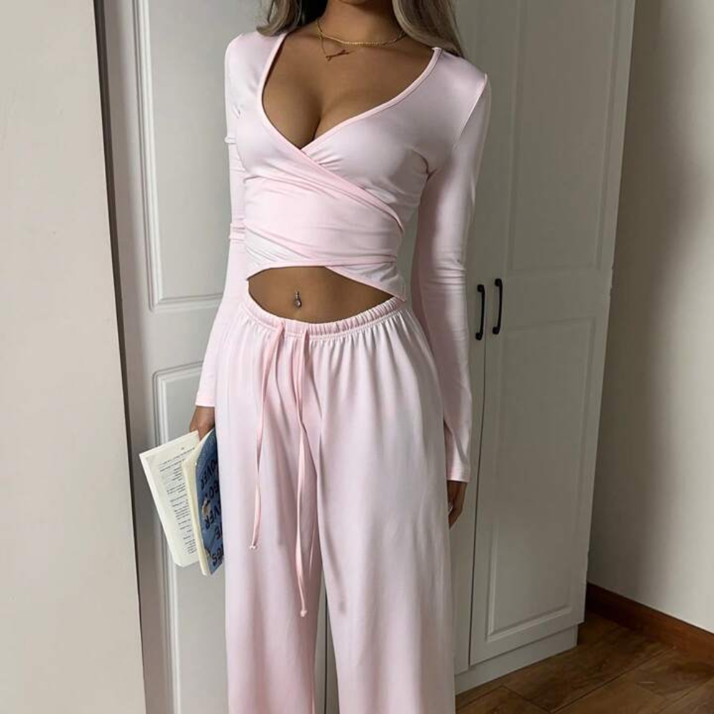 Cozy lounge set with a soft long sleeve top and loose fitting bottoms.