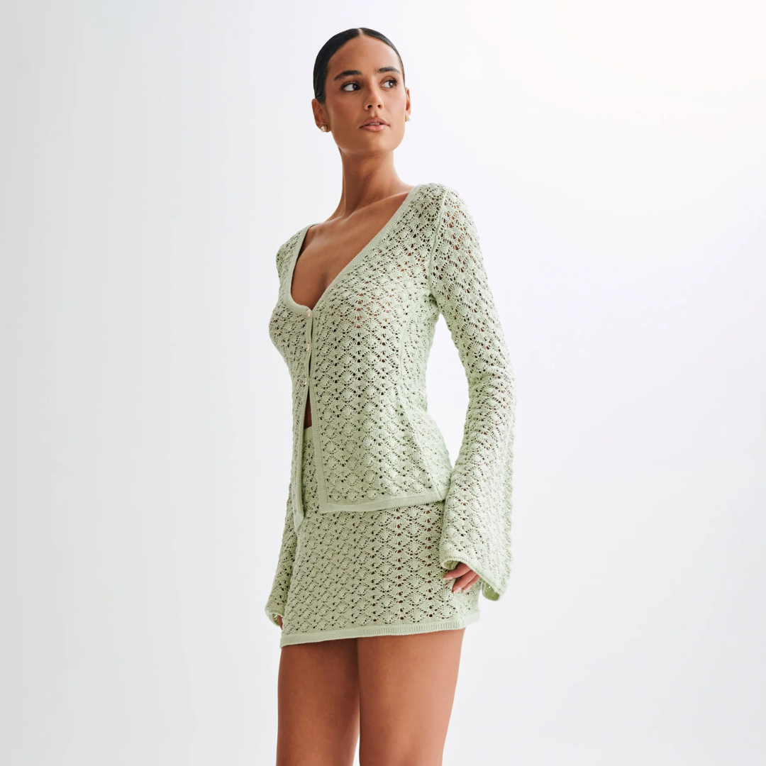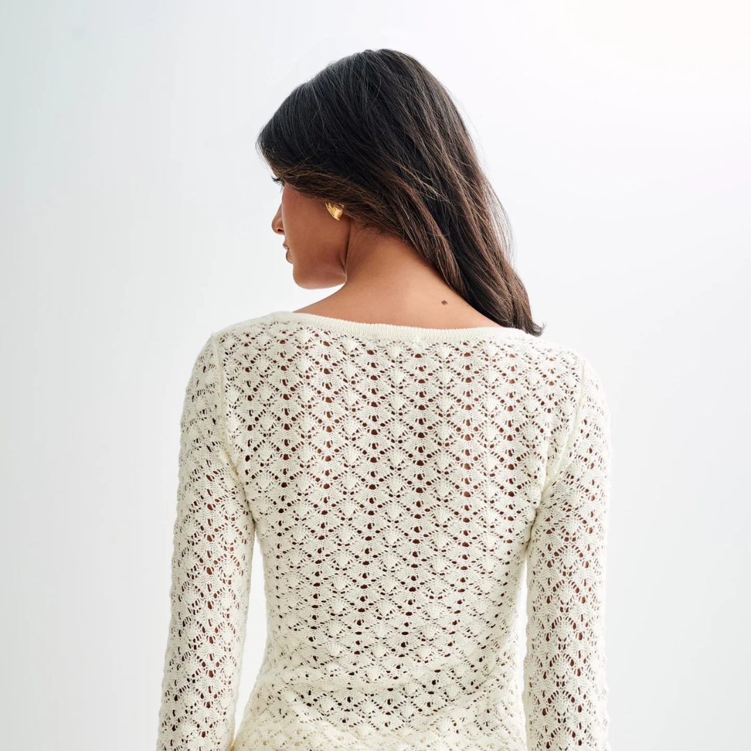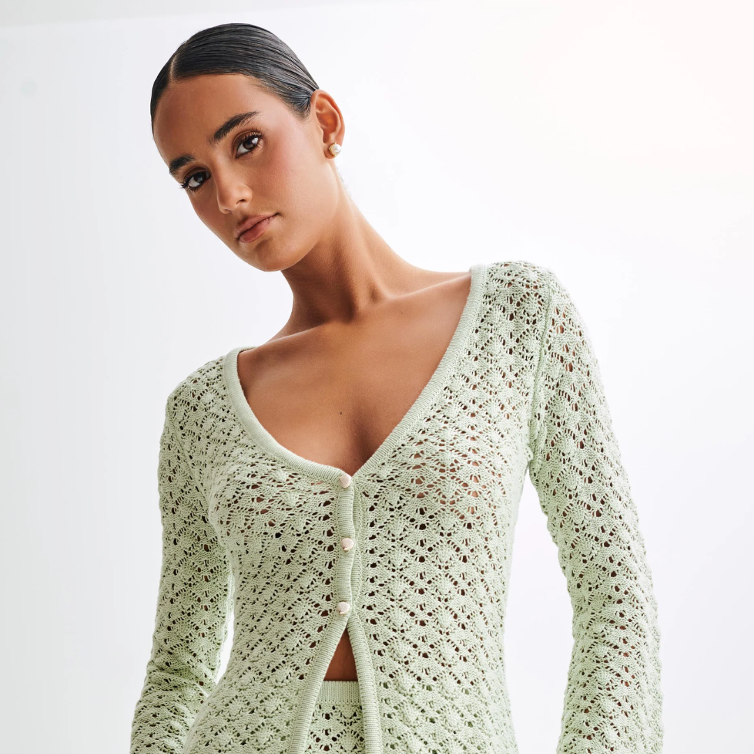 Crafted in a soft knit blend, the Adore Duo features a subtle off white hue that glides between refined minimalism and luxe ease. The button front closure trails down from a graceful V neckline, while the longline silhouette elongates the frame and the long sleeves bring polished coverage.