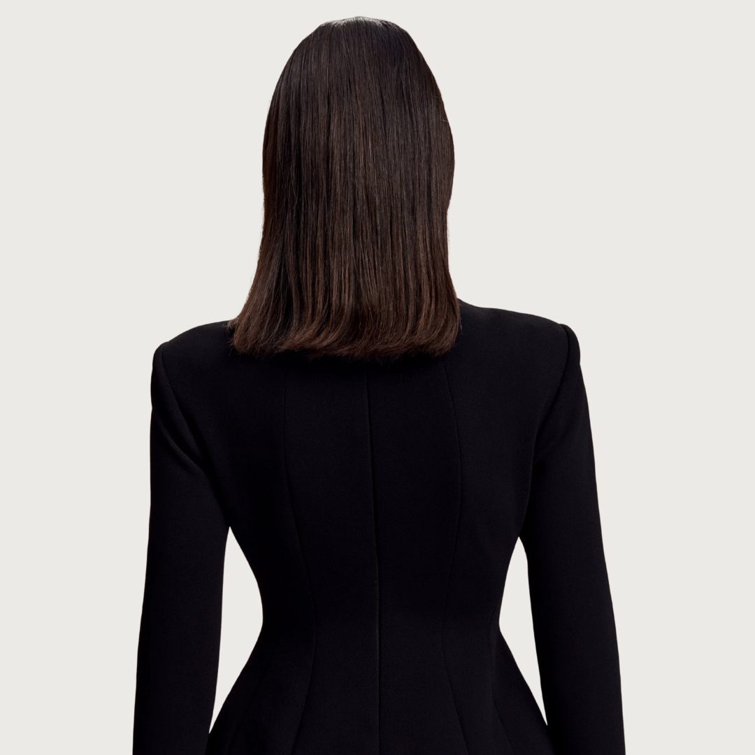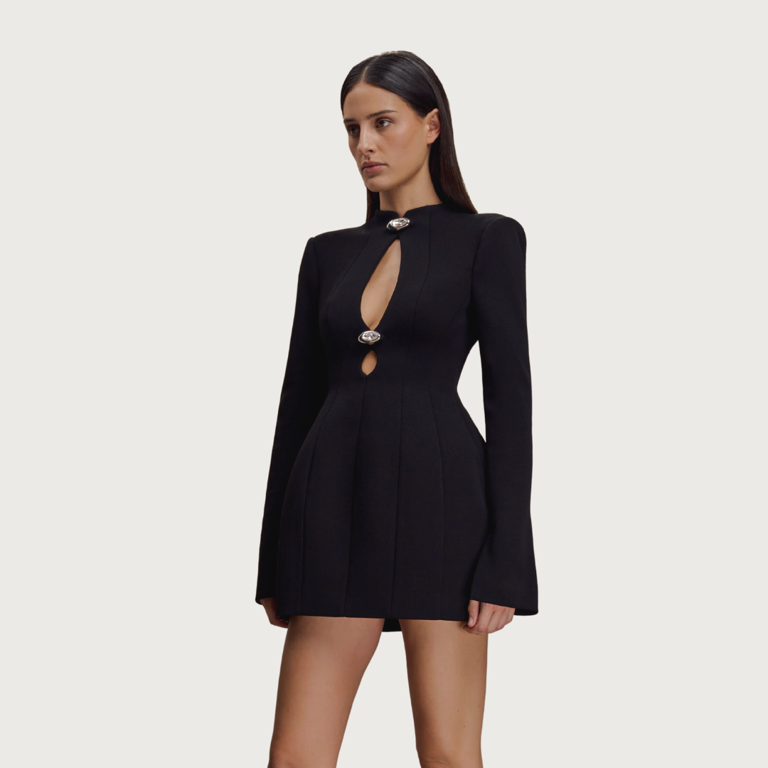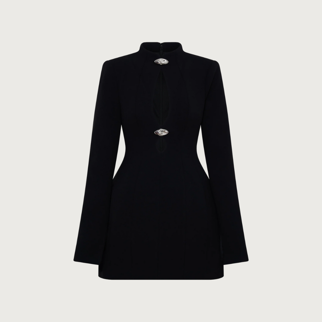 A sharp, seductive silhouette made for after dark entrances. Slovenia Formal Mini features a sleek high neckline with a daring keyhole cut out at the center, accented with polished hardware that draws the eye. Clean seam lines sculpt the waist and hips, while the mini length keeps the look bold and irresistible.