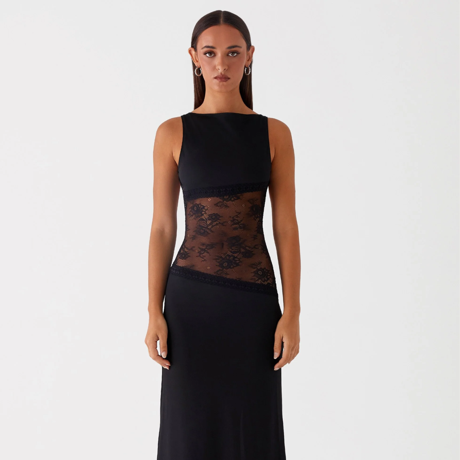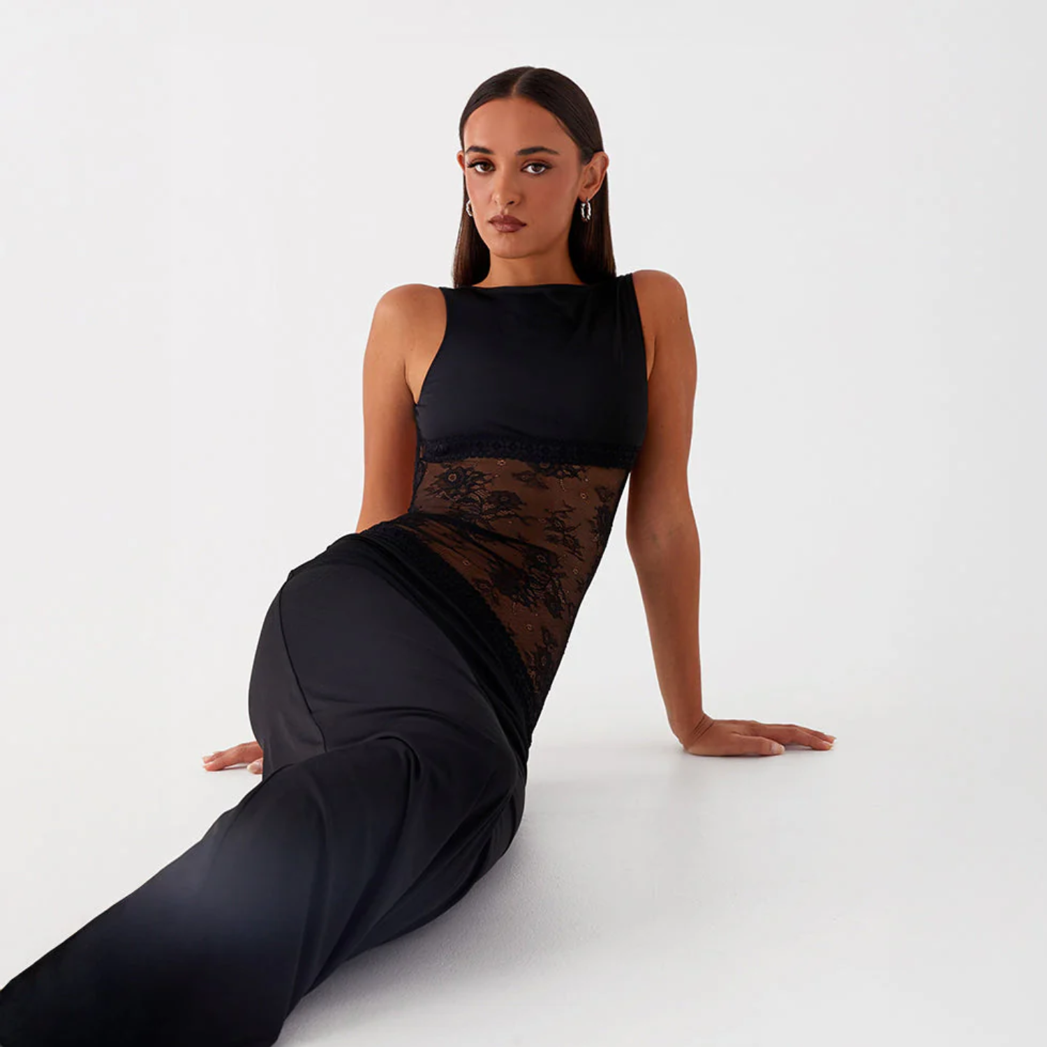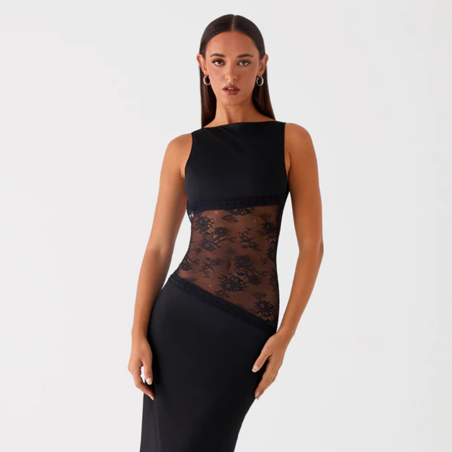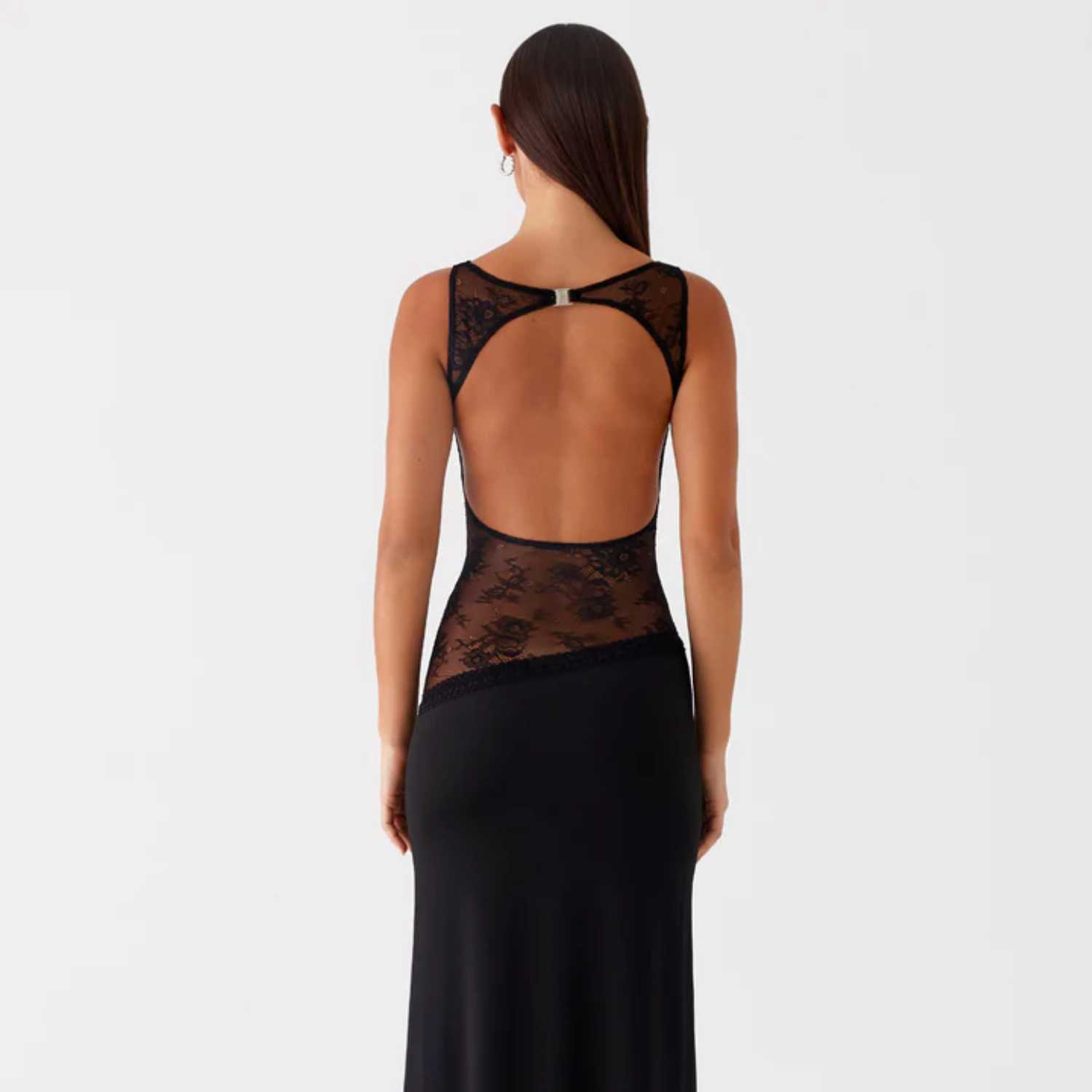 Smoke & Silk Maxi captures a kind of beauty that feels effortless yet unforgettable. The rounded neckline frames the décolletage with subtle sophistication, while the dramatic low back and modern buckle detail add a mesmerizing contrast; elegant in the front, entrancing from behind. Every element is intentionally refined, from the smooth lining to the flawless fall of the skirt, creating a dress that feels custom made to flatter.