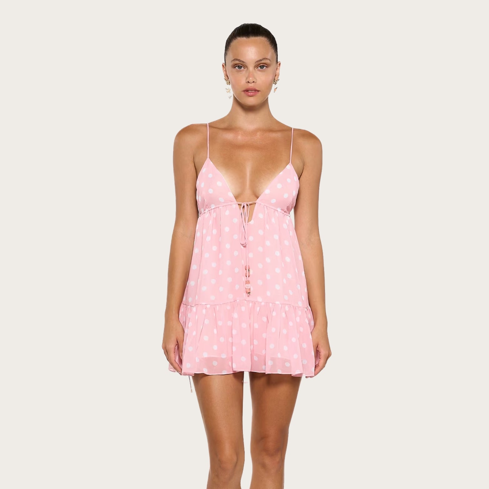The Valeria Dotted Mini Dress is a playful, feminine piece that instantly elevates your warm weather wardrobe. Featuring a soft peach hue adorned with classic polka dots, this mini silhouette brings effortless charm and breezy confidence to every look.