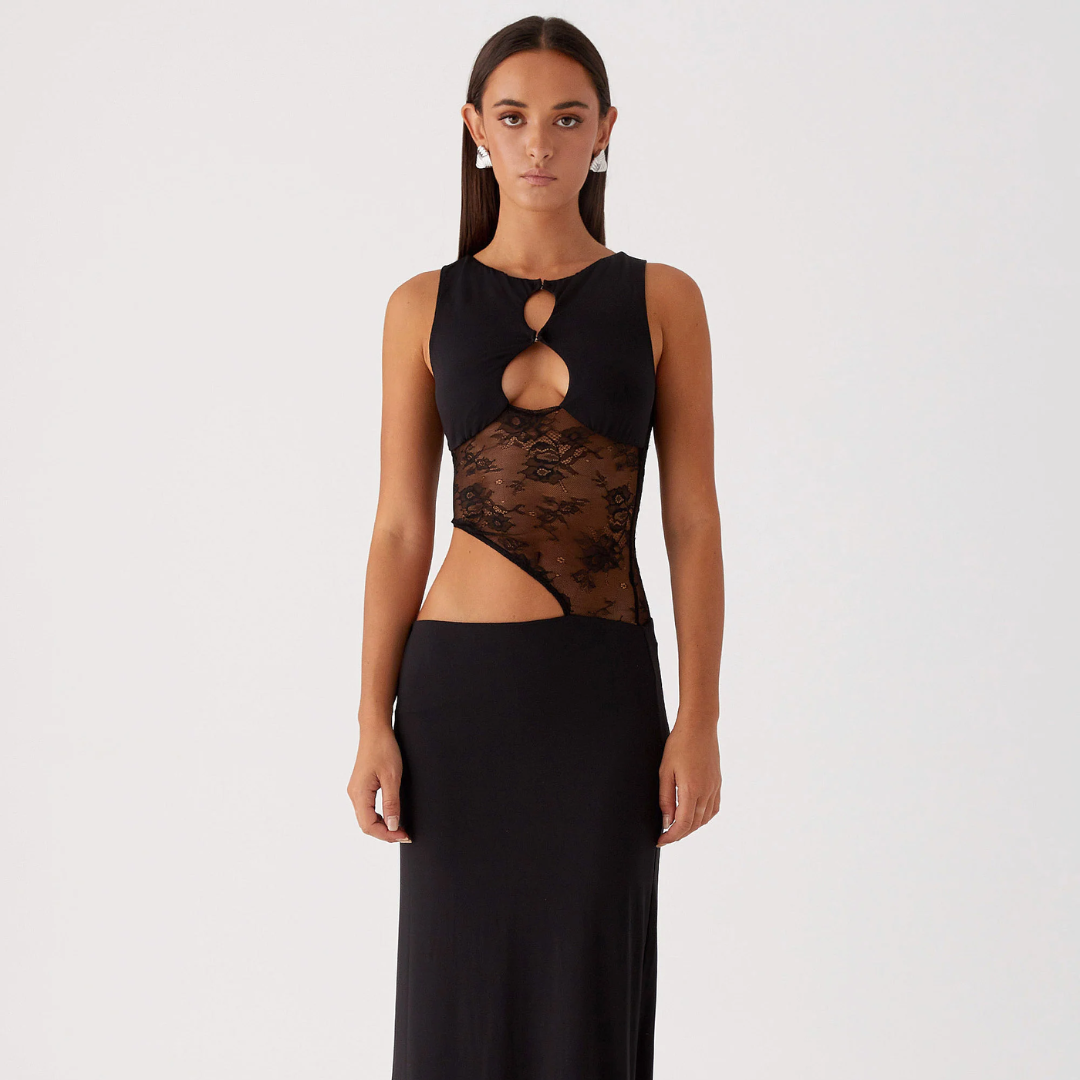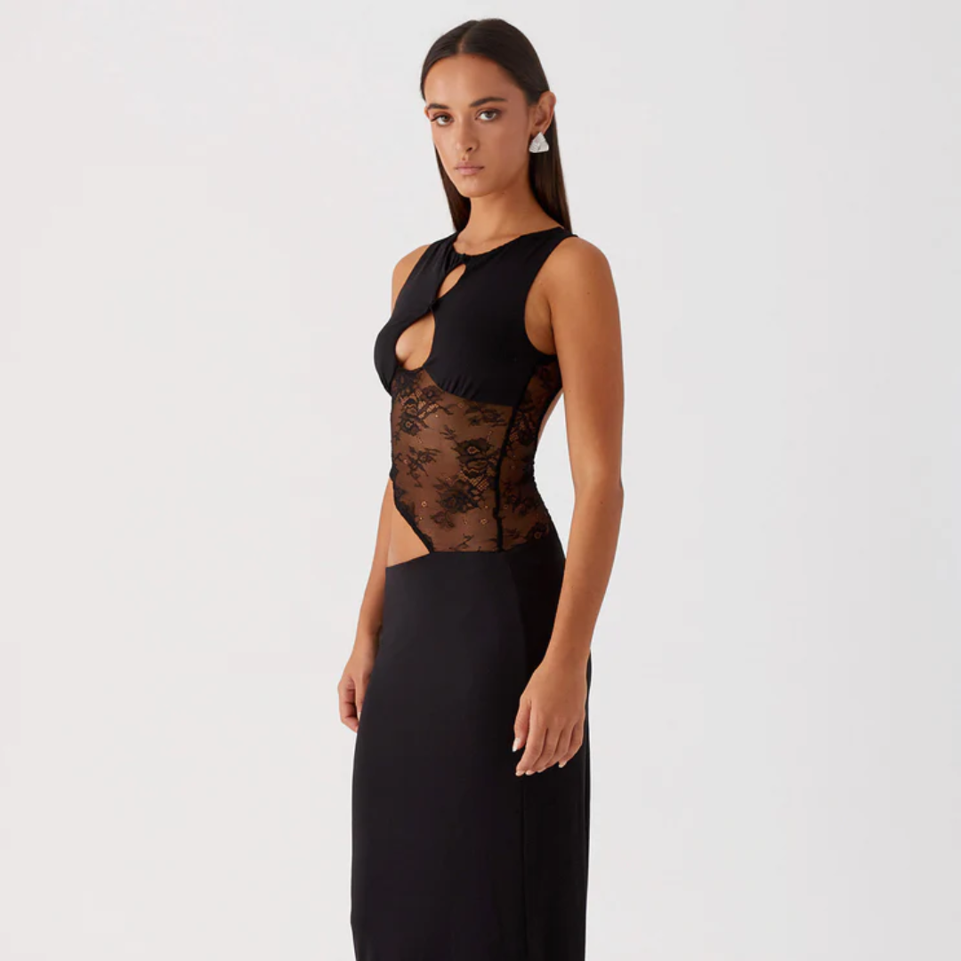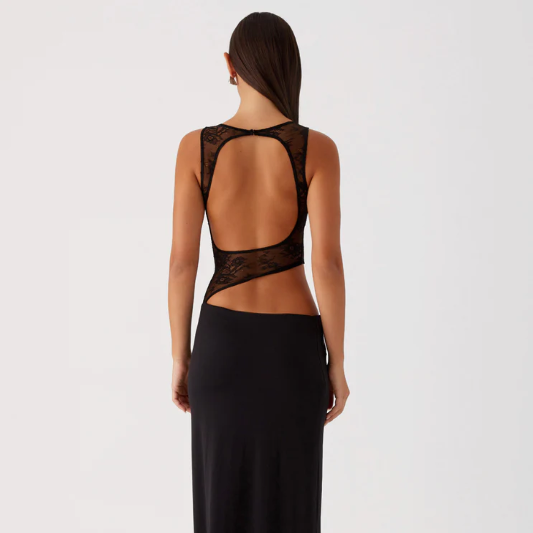 Velvet Omen Maxi blends sleek jersey with lace insets, creating contrast and modern shape. The front and side cutouts bring high a touch of class, while the low back and flowing length give it an understated drama. Semi sheer details keep it bold but wearable.