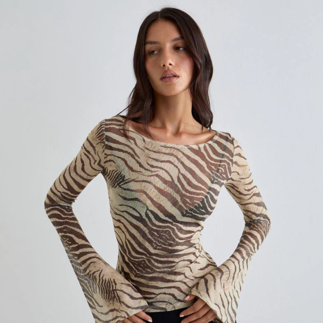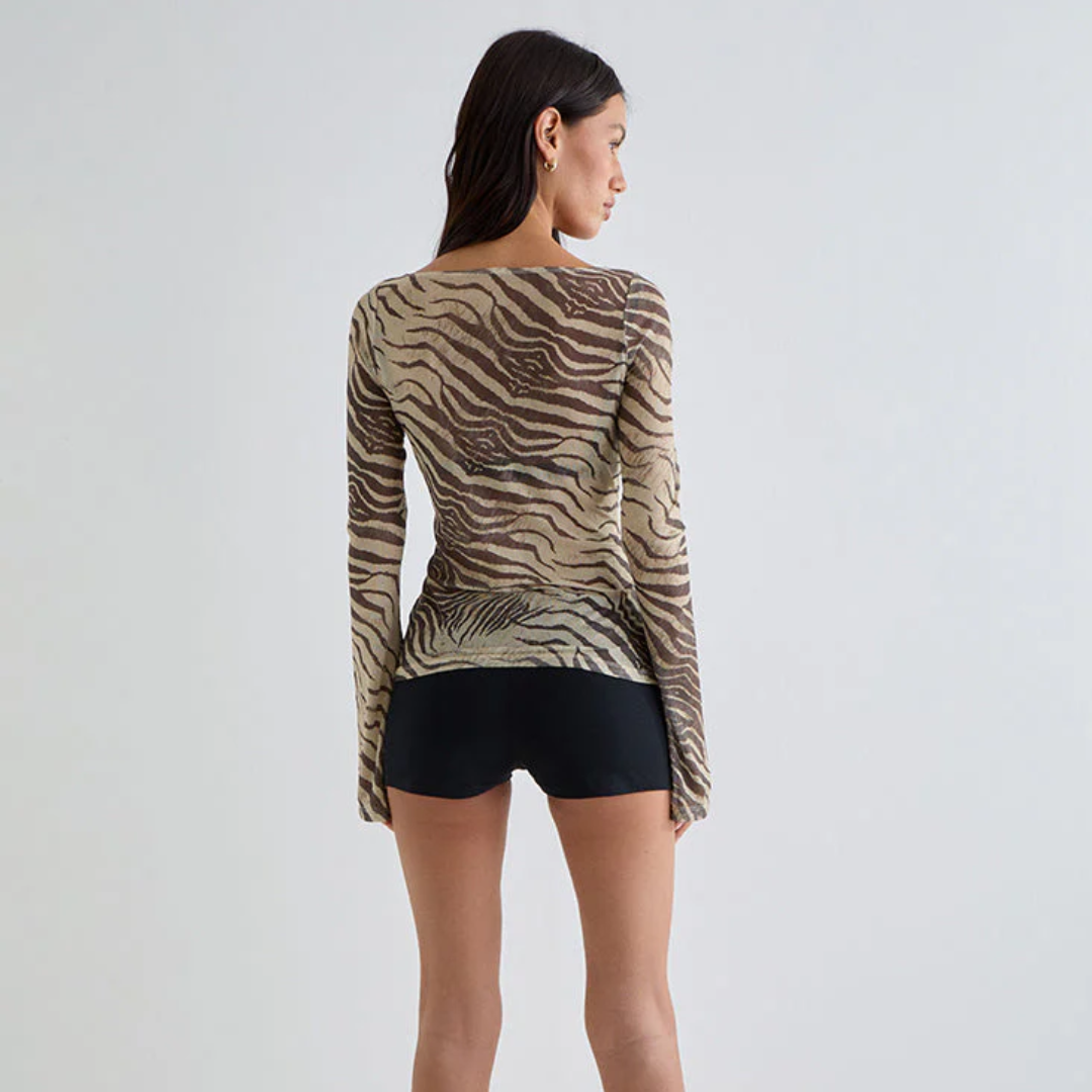 Regardless of the outfit, the Serengeti Long Sleeve is the main attraction. A simple yet timeless striped top with a breezy mesh design. The subtle tiger print brings passion to an already shaped figure and the flared sleeves add an extra layer of depth to this top. It's a chic essential that likely already goes with everything in your wardrobe.