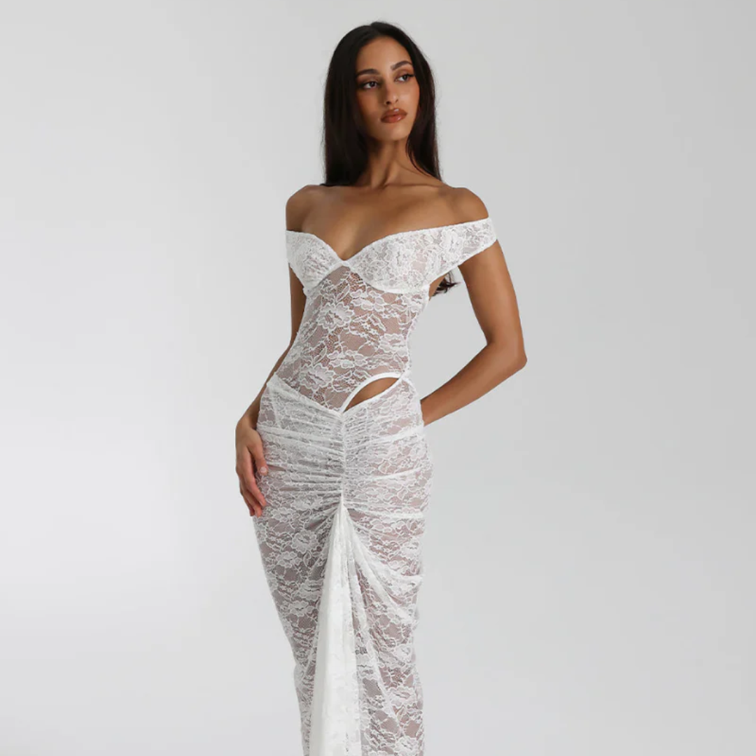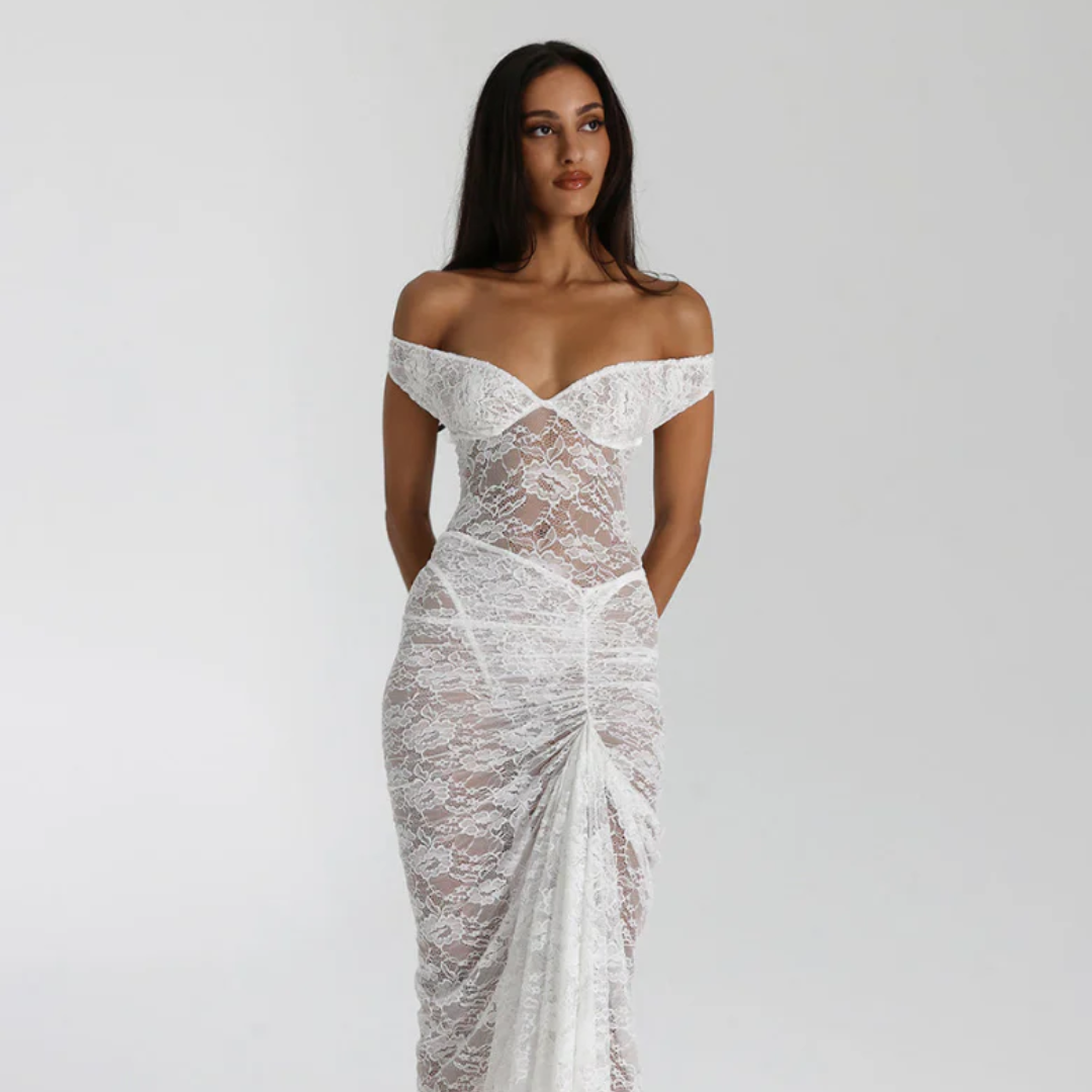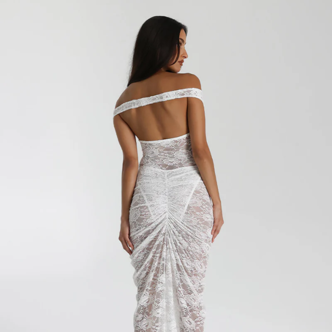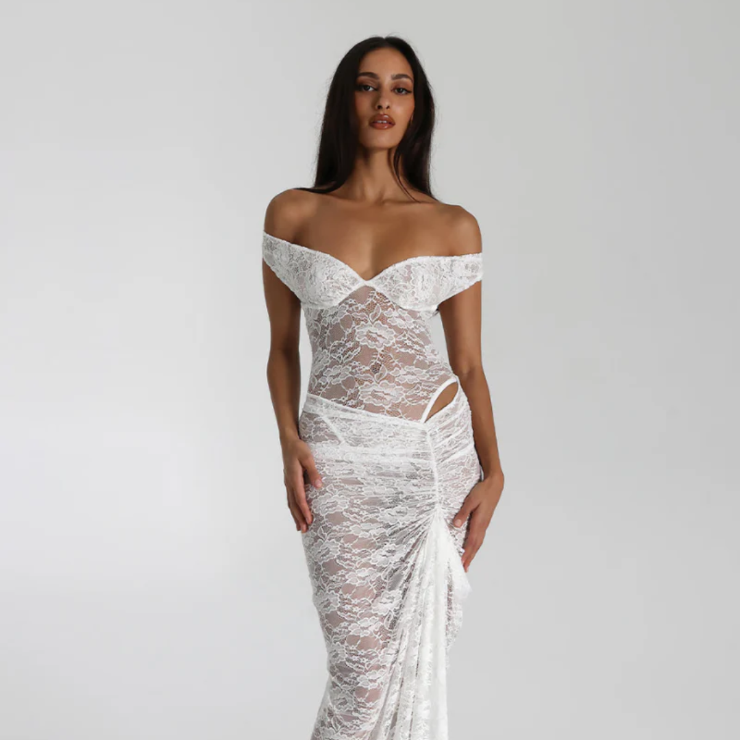 White Lies sits gracefully on the shoulders in a soft, structured neckline, exposing just enough collarbone for poise and drama. Crafted in luxe white lace, the semi sheer texture brings feminine detail while the fitted bodice ensures clean lines and sculpted form. The coordinating skirt delivers refined movement. Hugging the hips before gently flaring to a mid length hem, balancing sophistication with a modern edge.